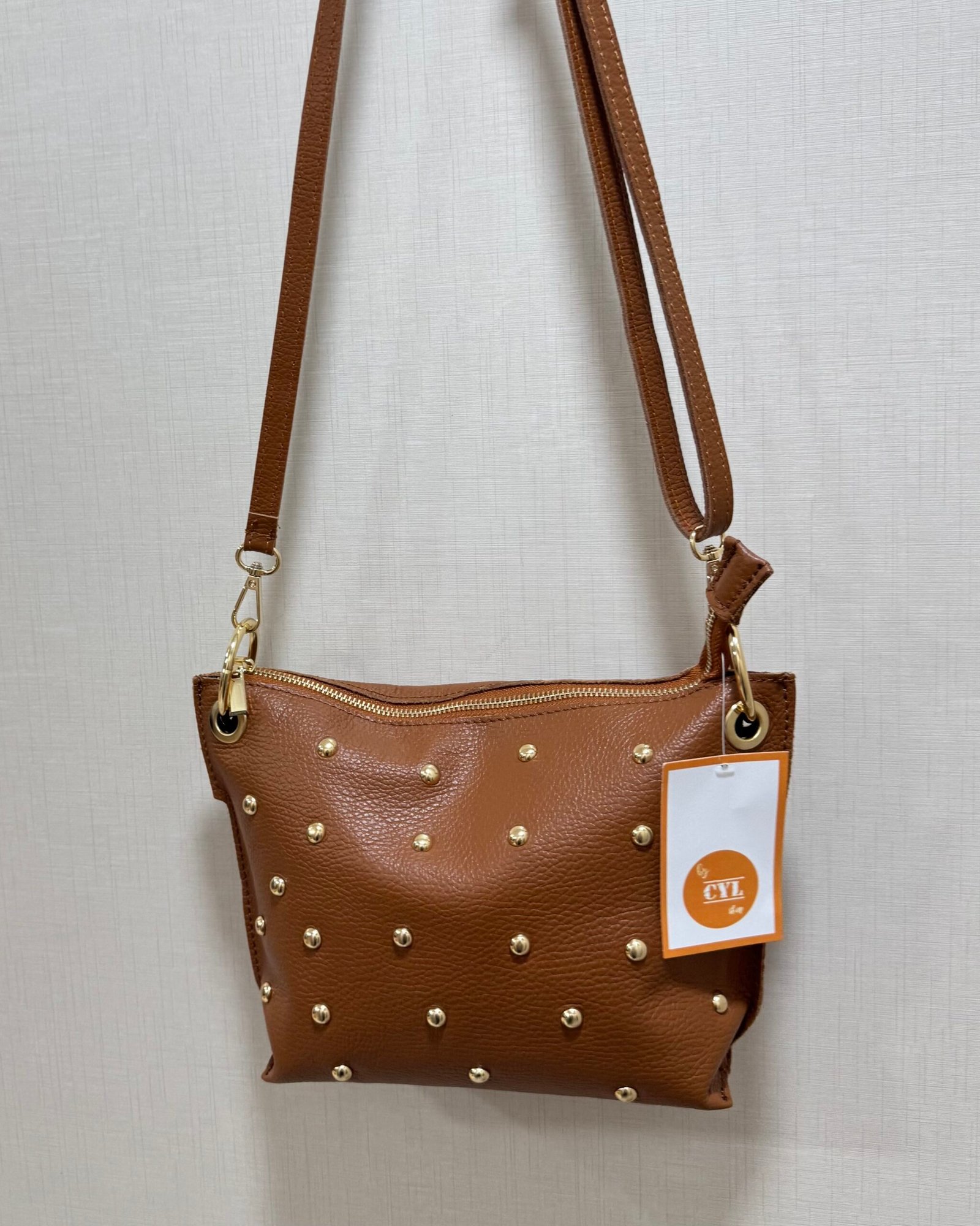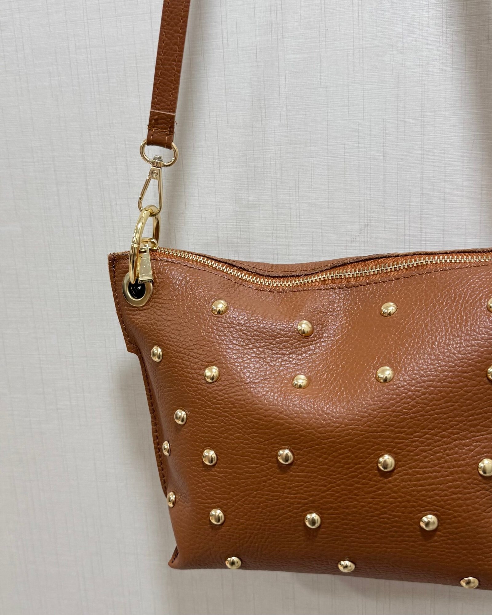 Bandolera con tachas doradas en color camel.