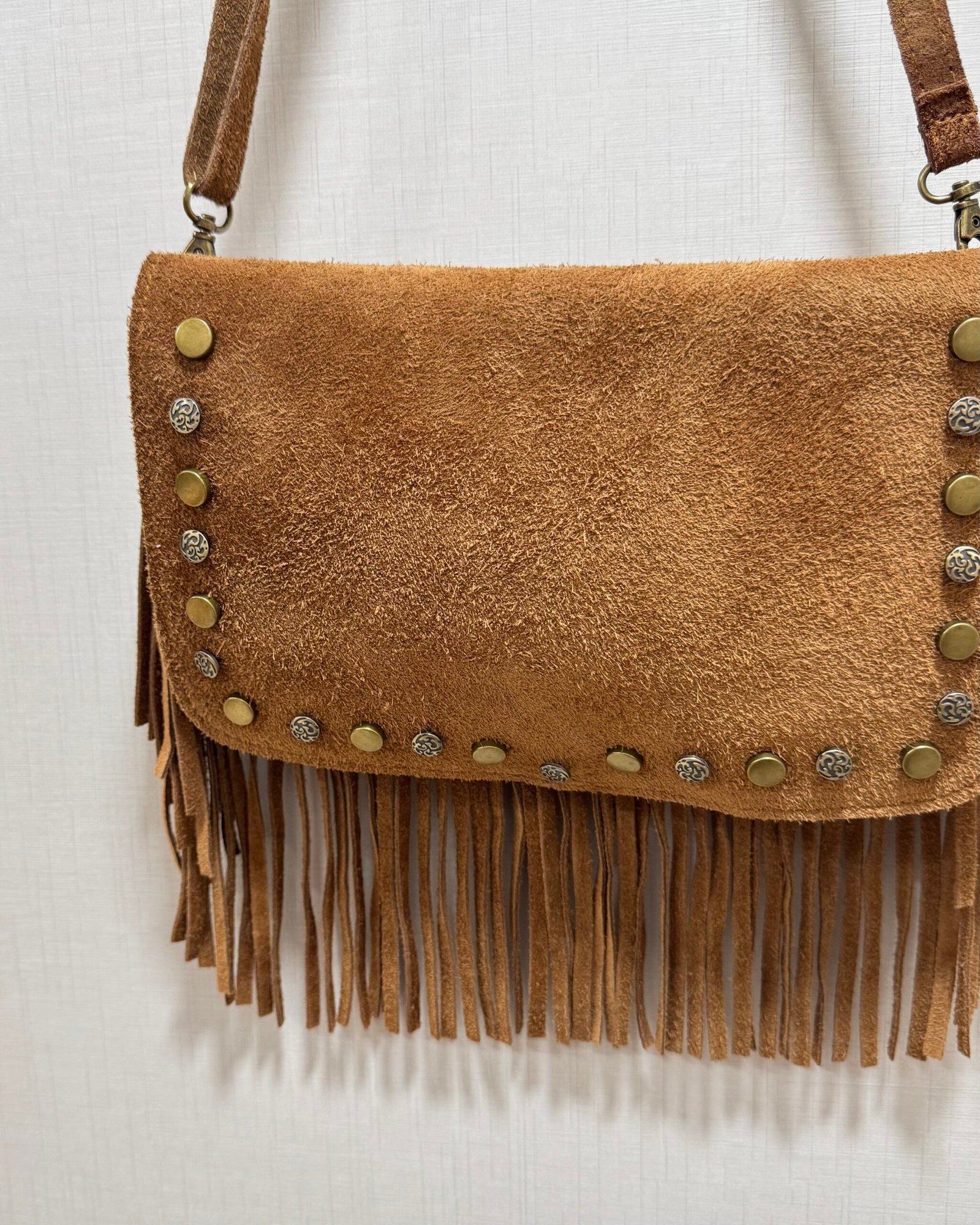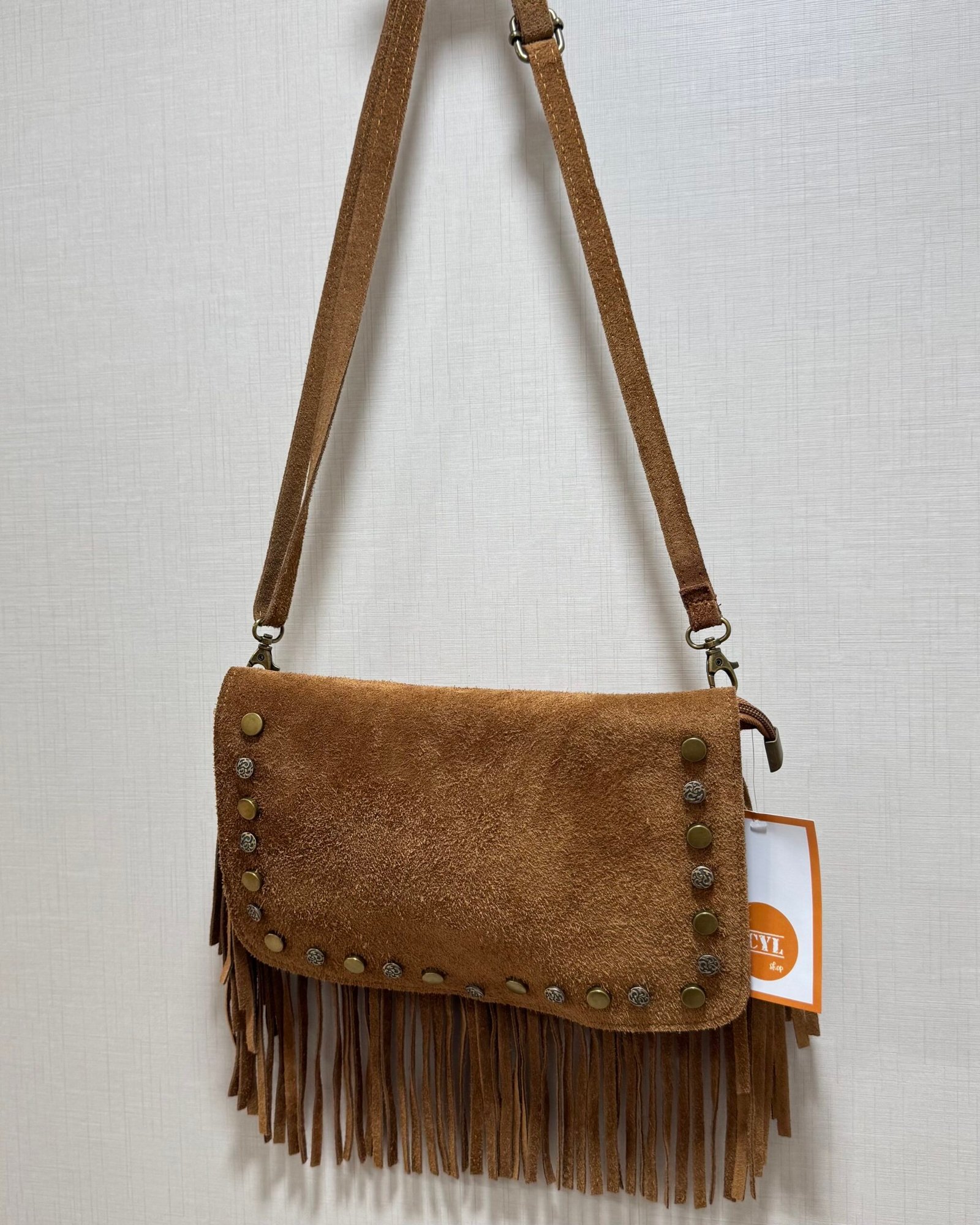 En color camel, de piel vuelta y con flequitos.