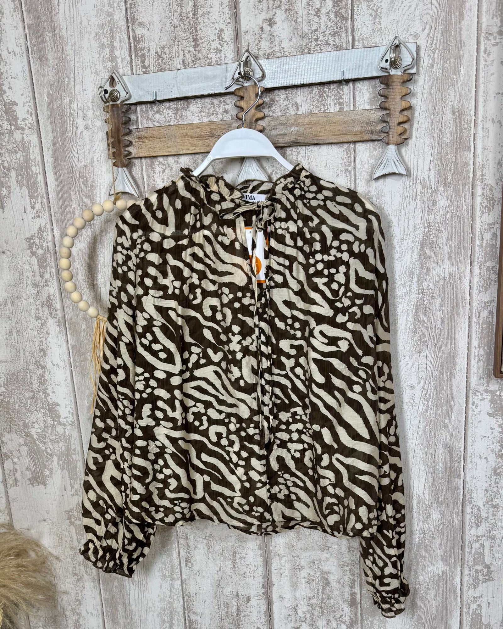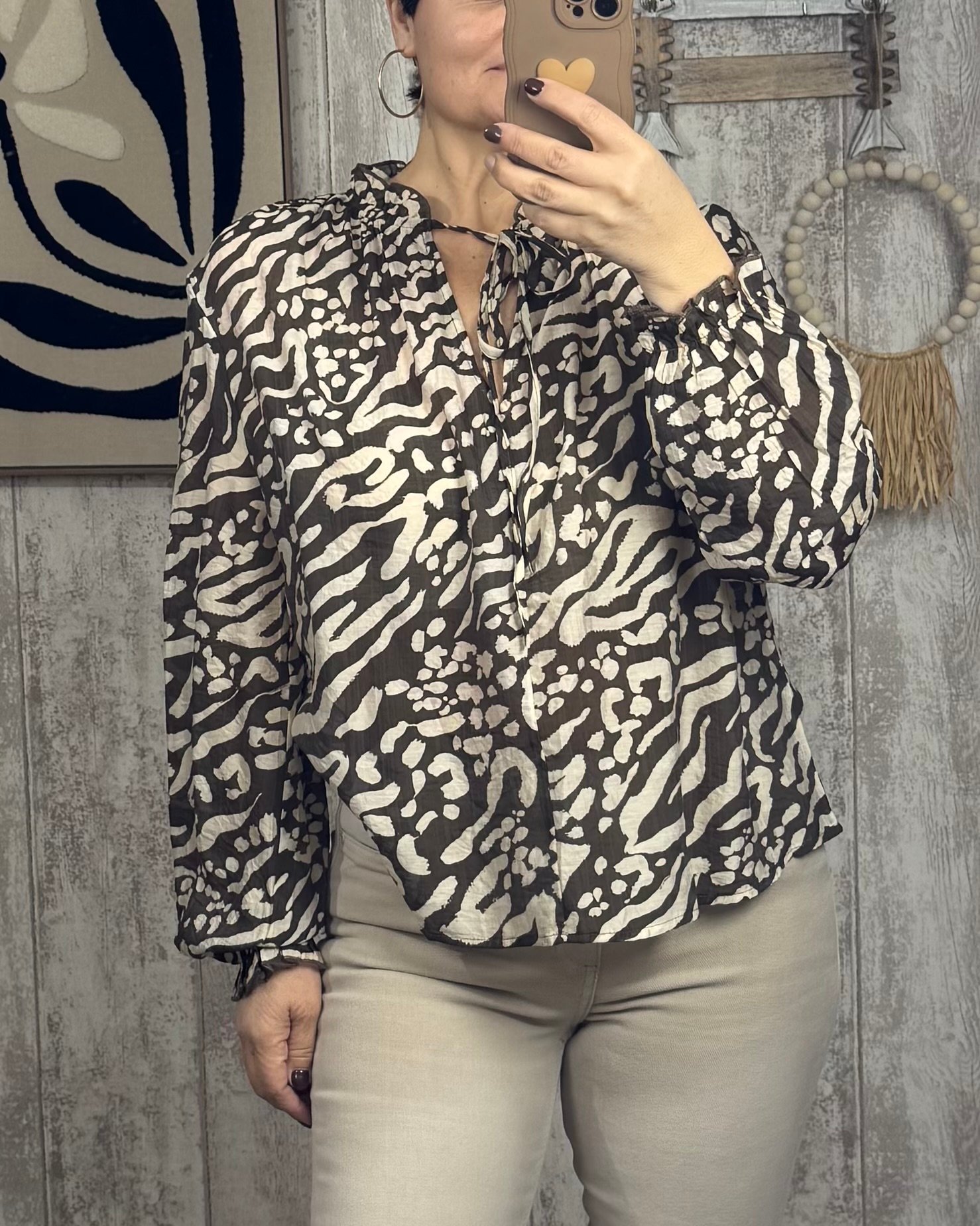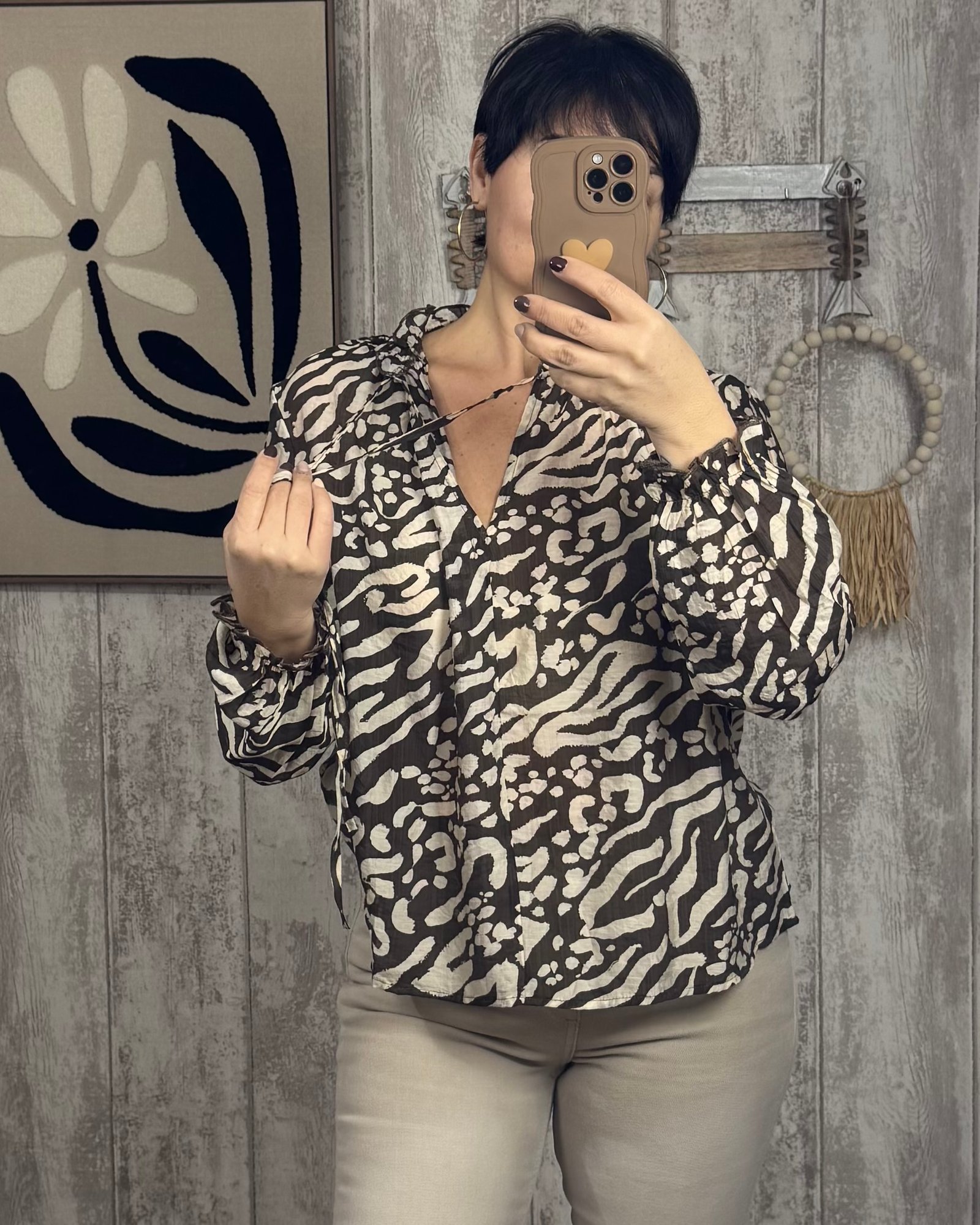 Blusa en estampado animal print, cuello mao rizado y con apertura que se anuda. Puños tb con rizo.