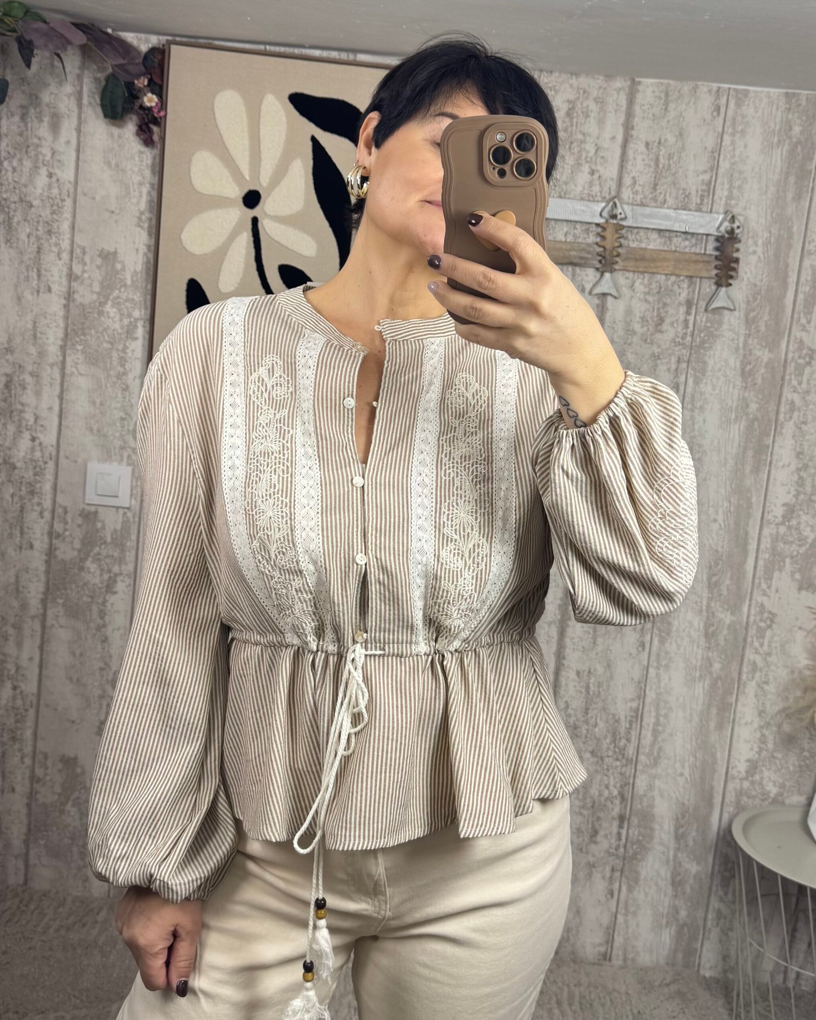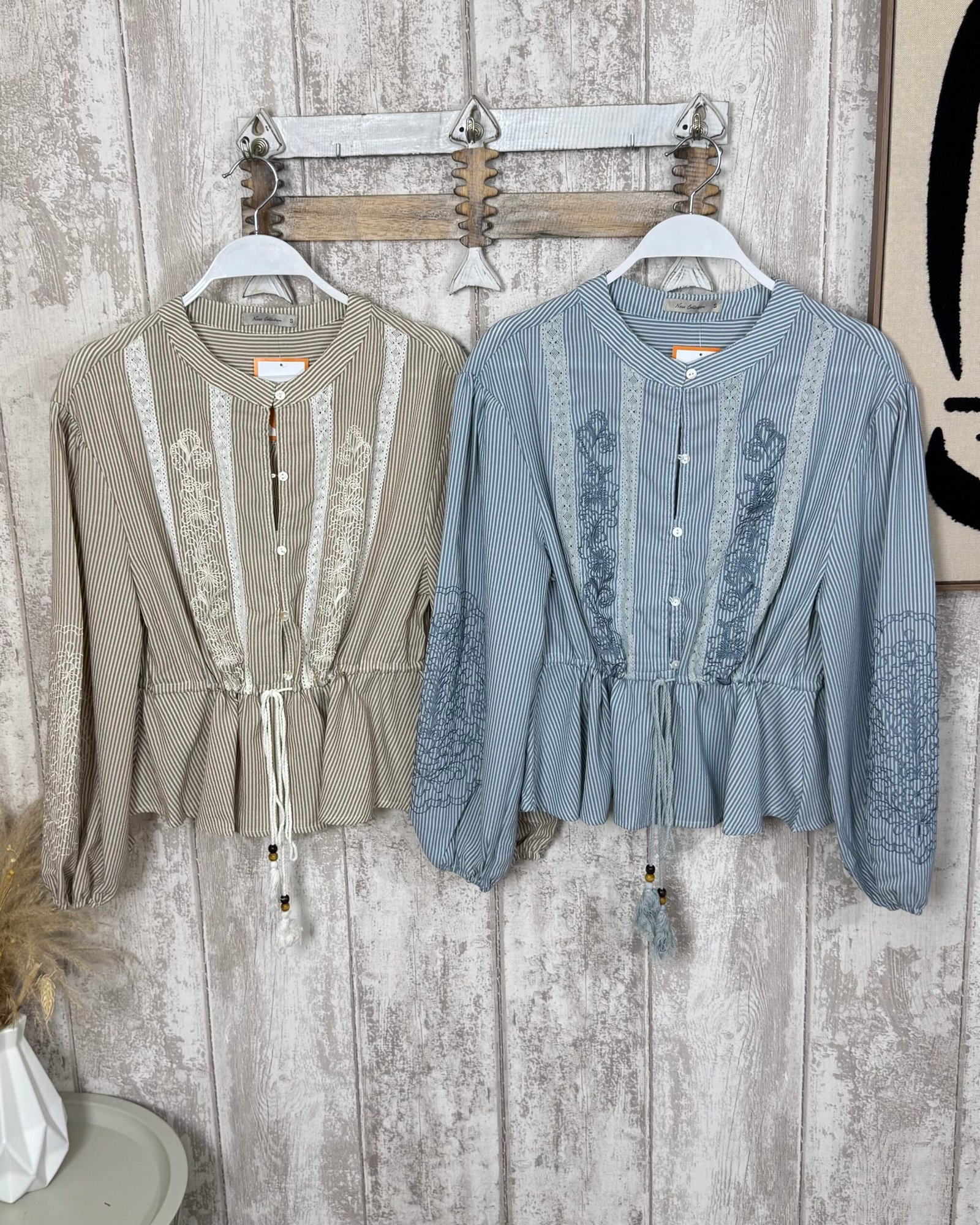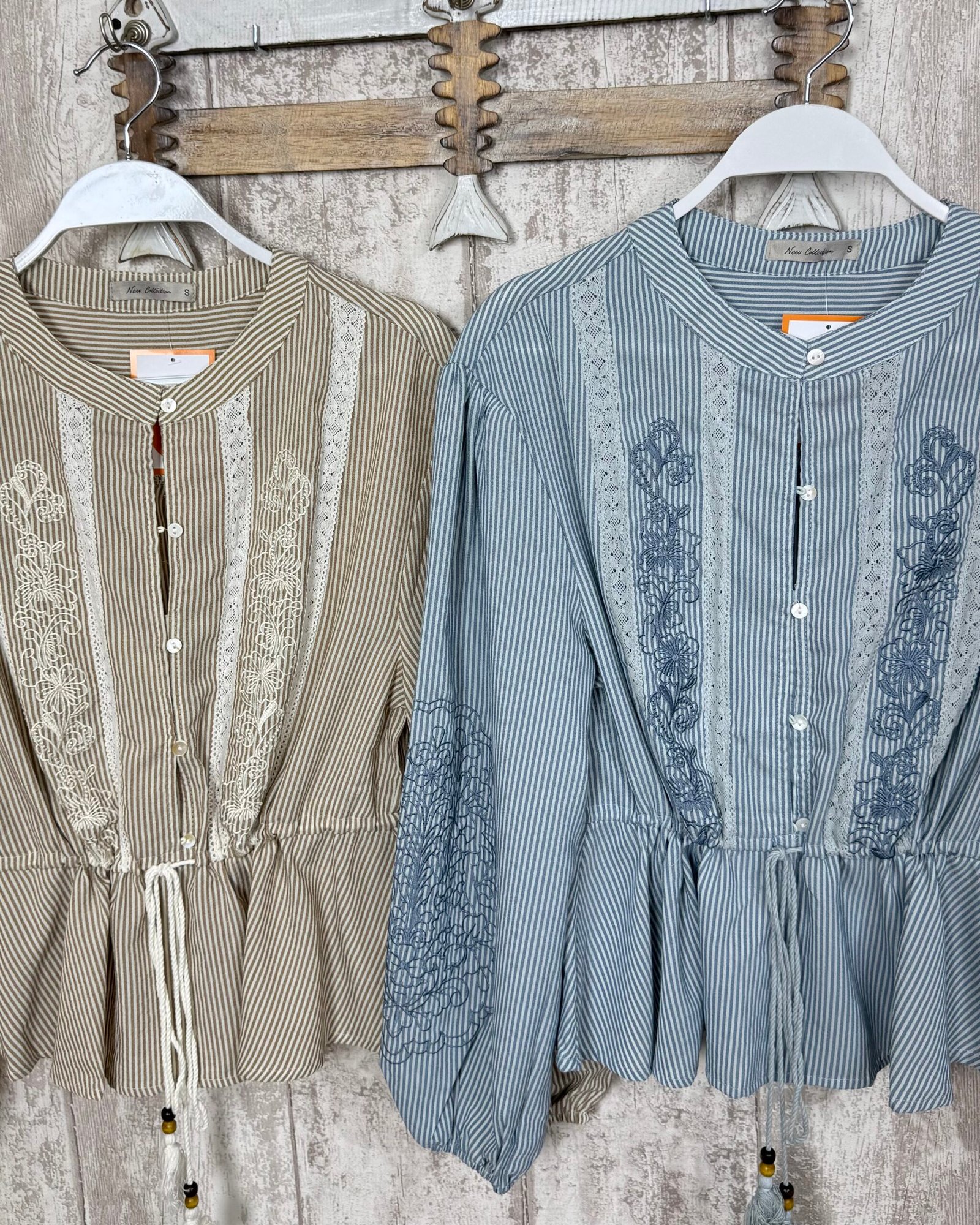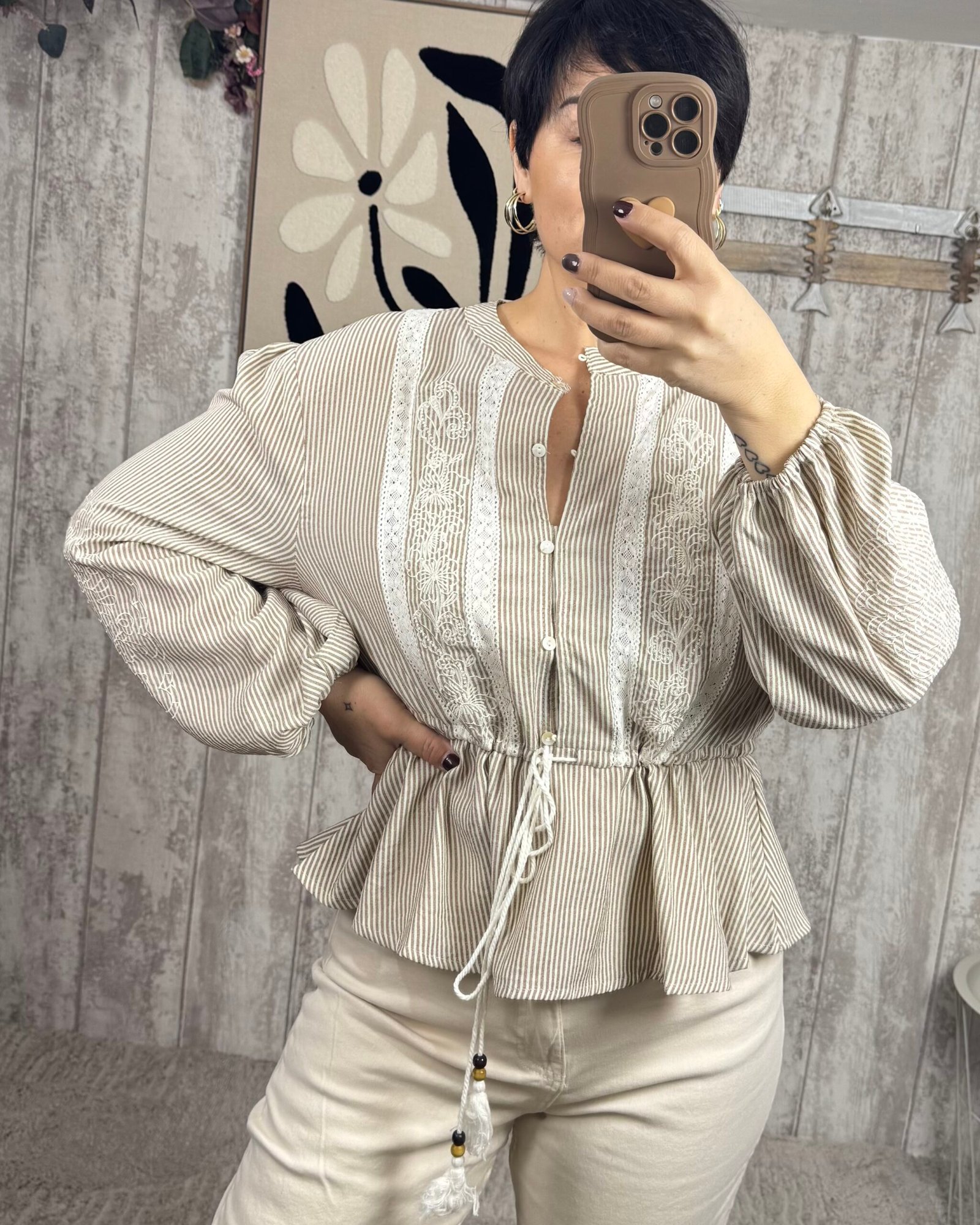 Blusa de rayitas, anudada en la cintura y con decoración bordada. Cuello mao.