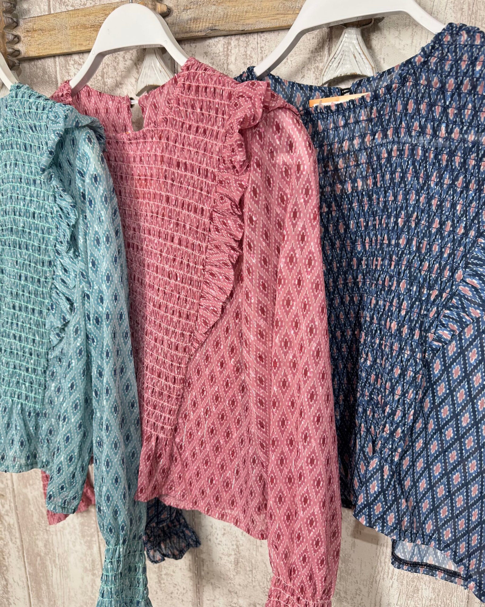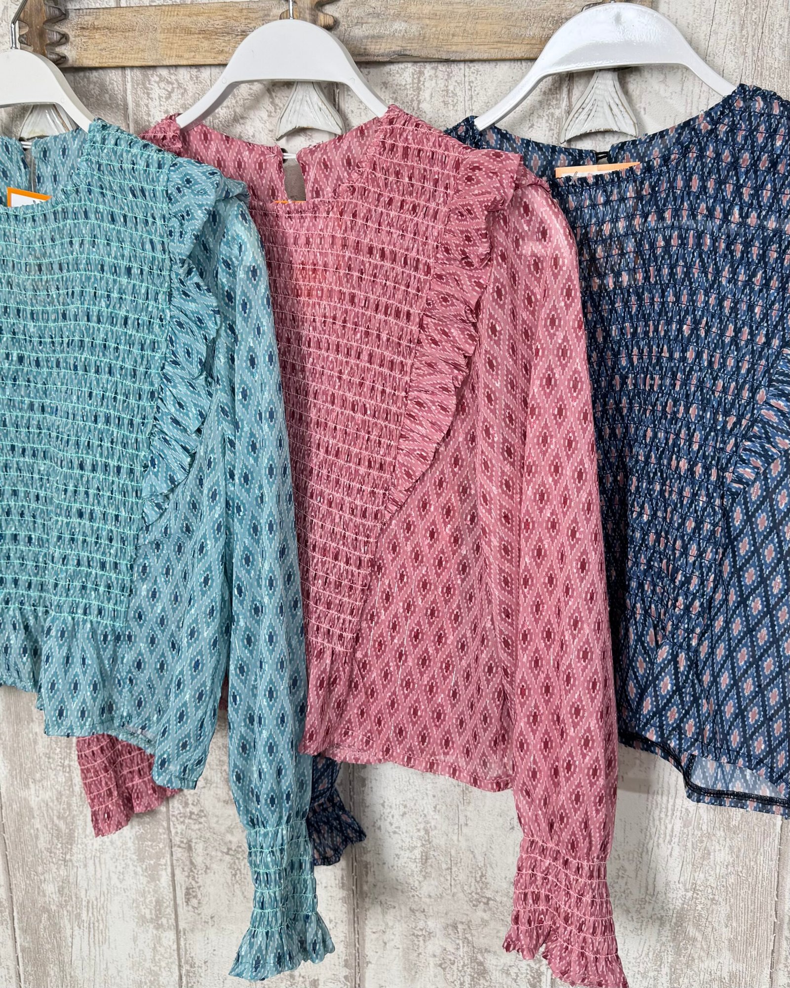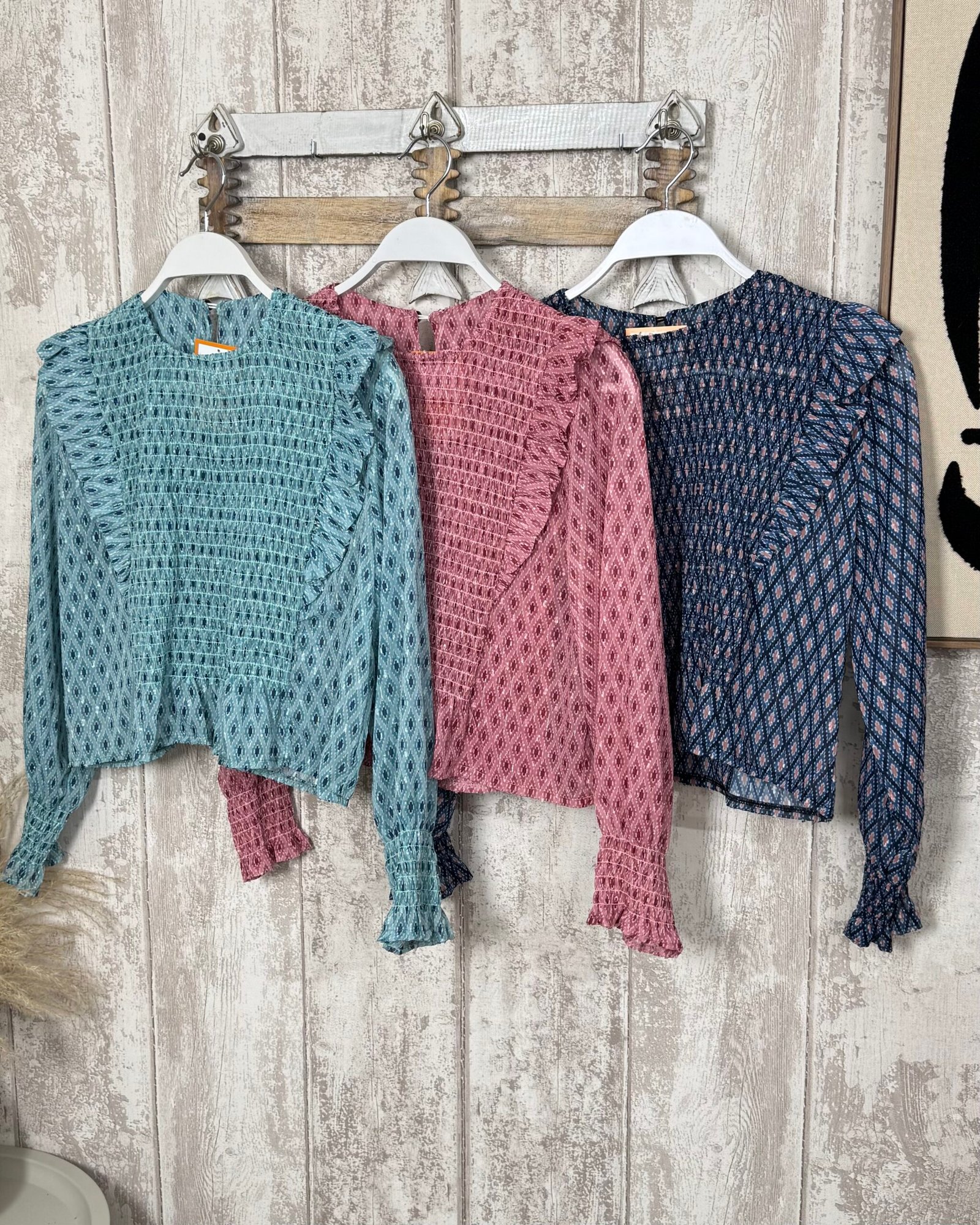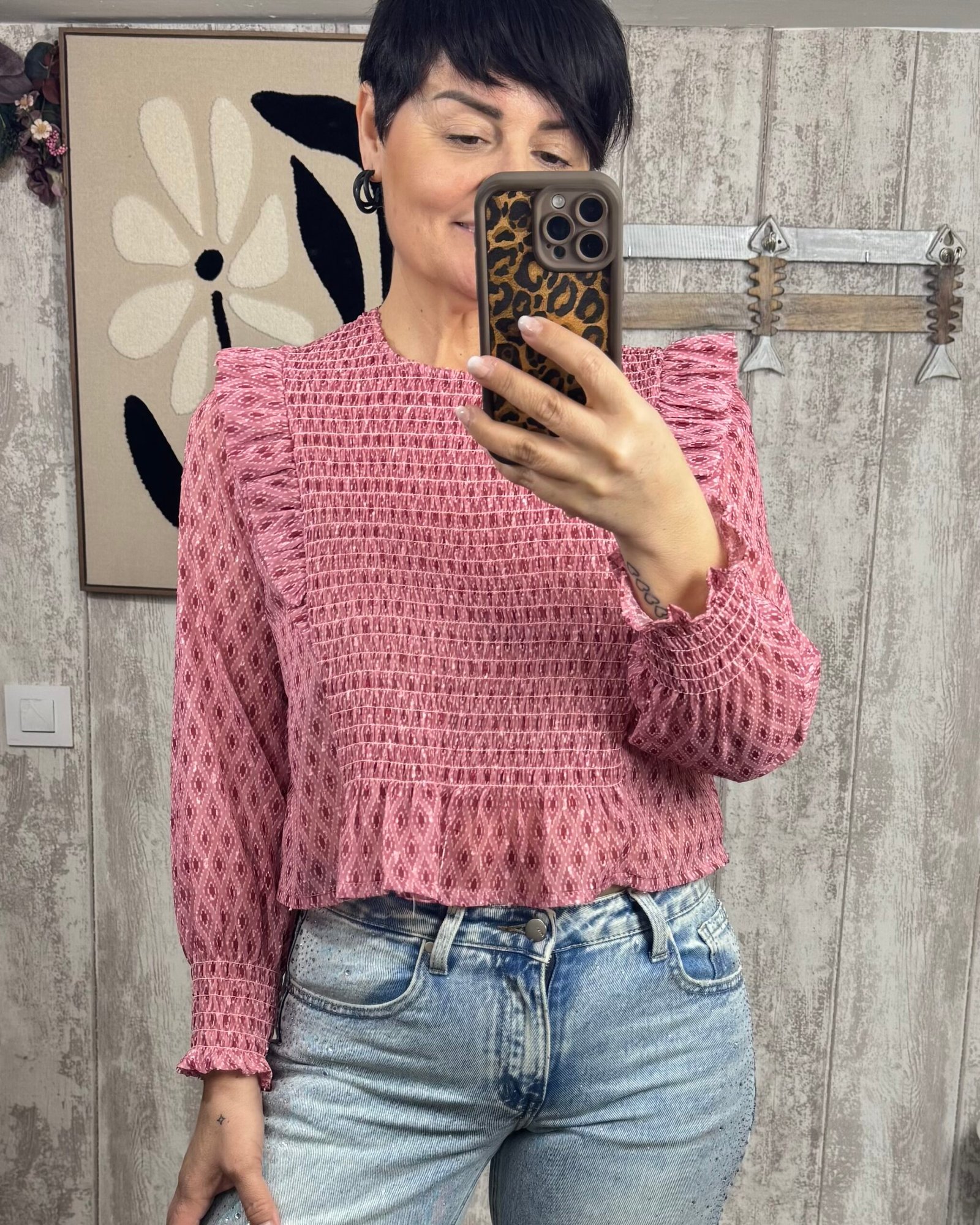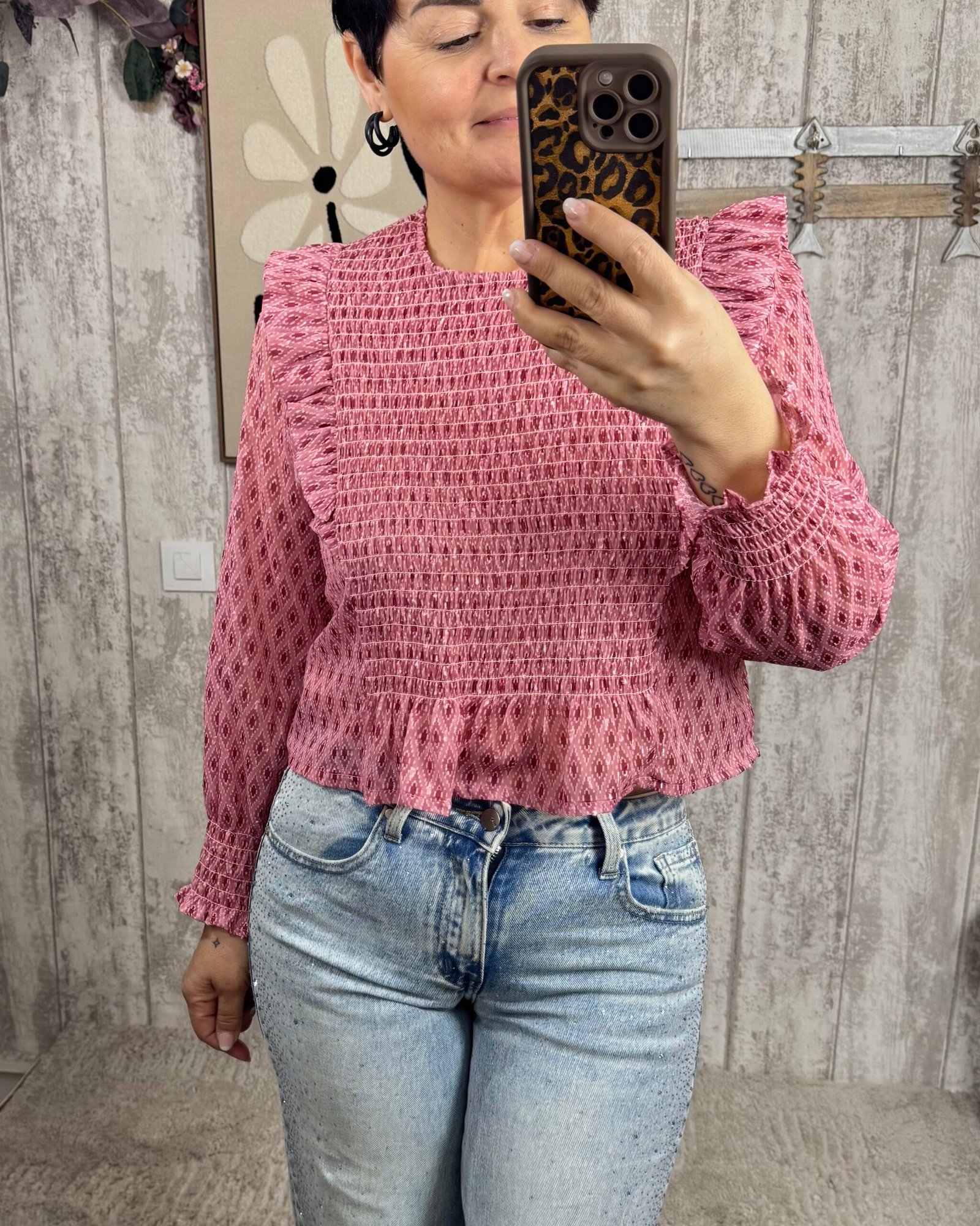 Blusa estampada, con nido de abeja en el cuerpo y mangas de gasa.
