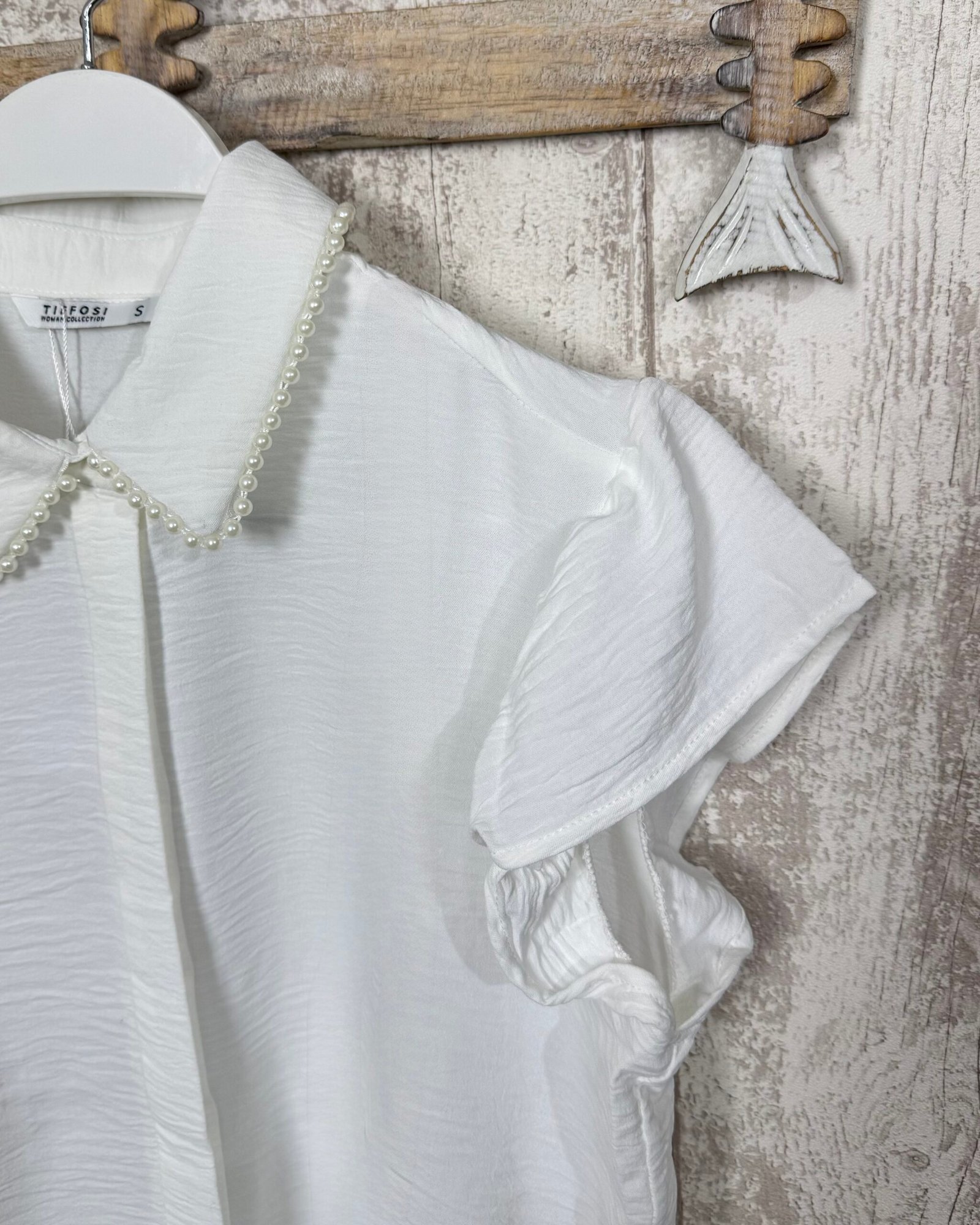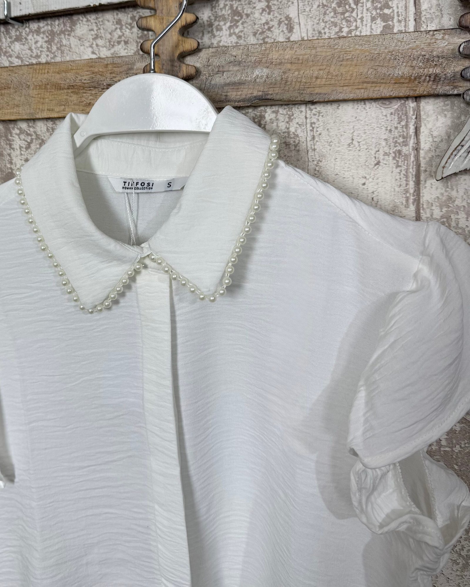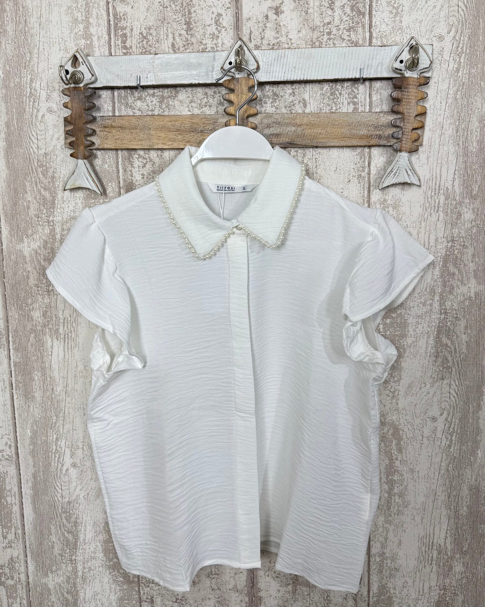 Camisa de manga corta. Decoración en el cuello con perlitas.