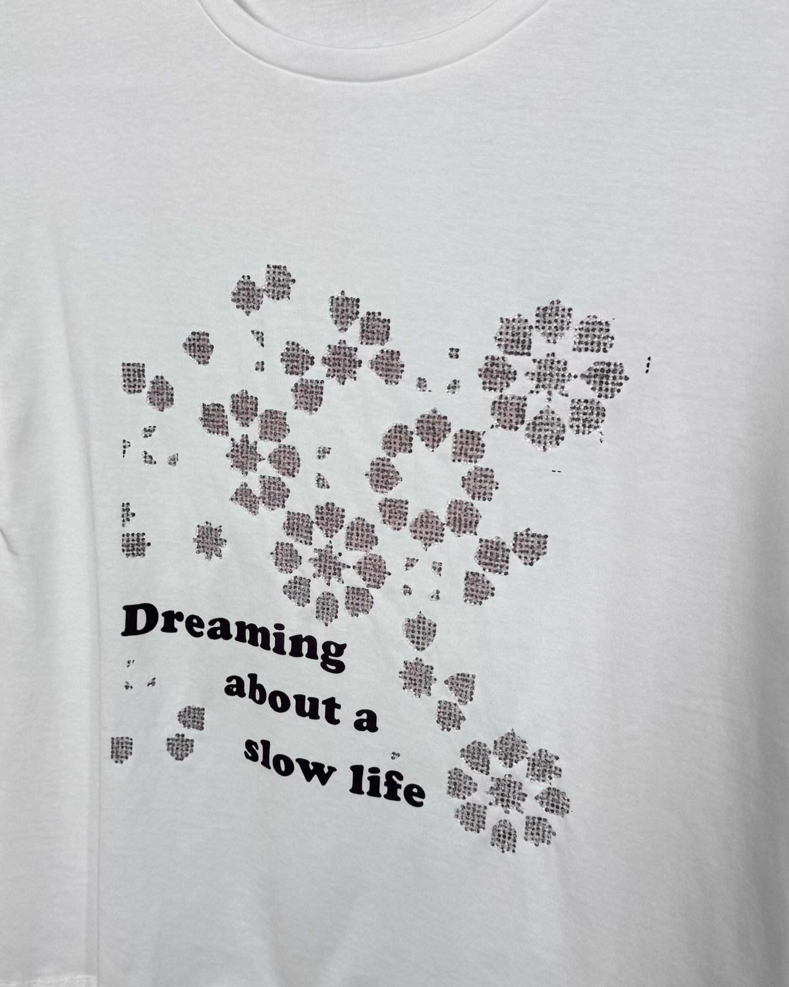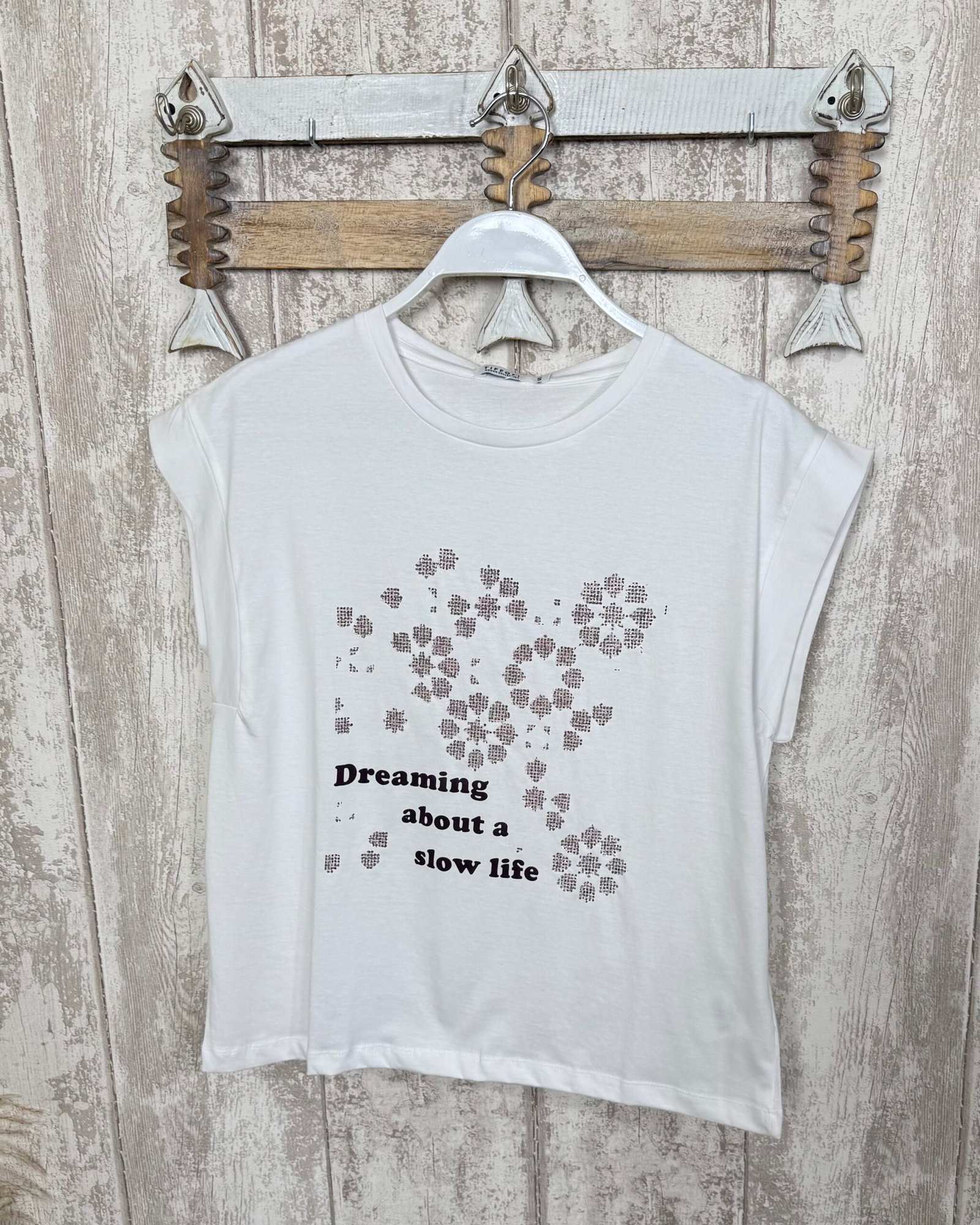 Camiseta blanca con detalles en marrón y la decoración tiene brillo y relieve.