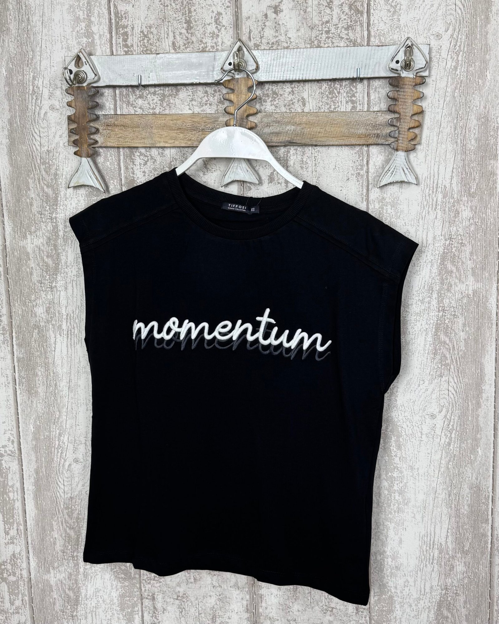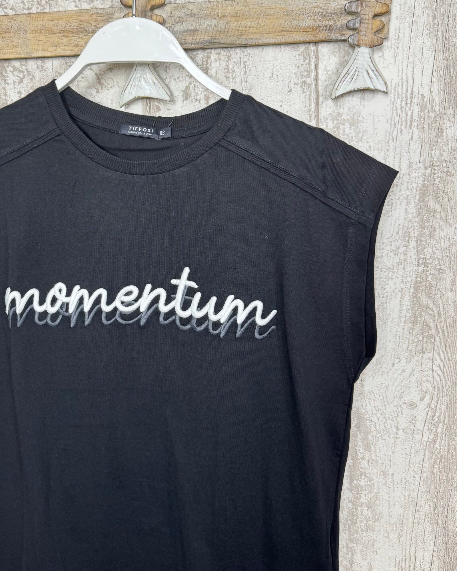 Camiseta en color negro y decorada con la palabra ”momentos” bordada en blanco y gris.