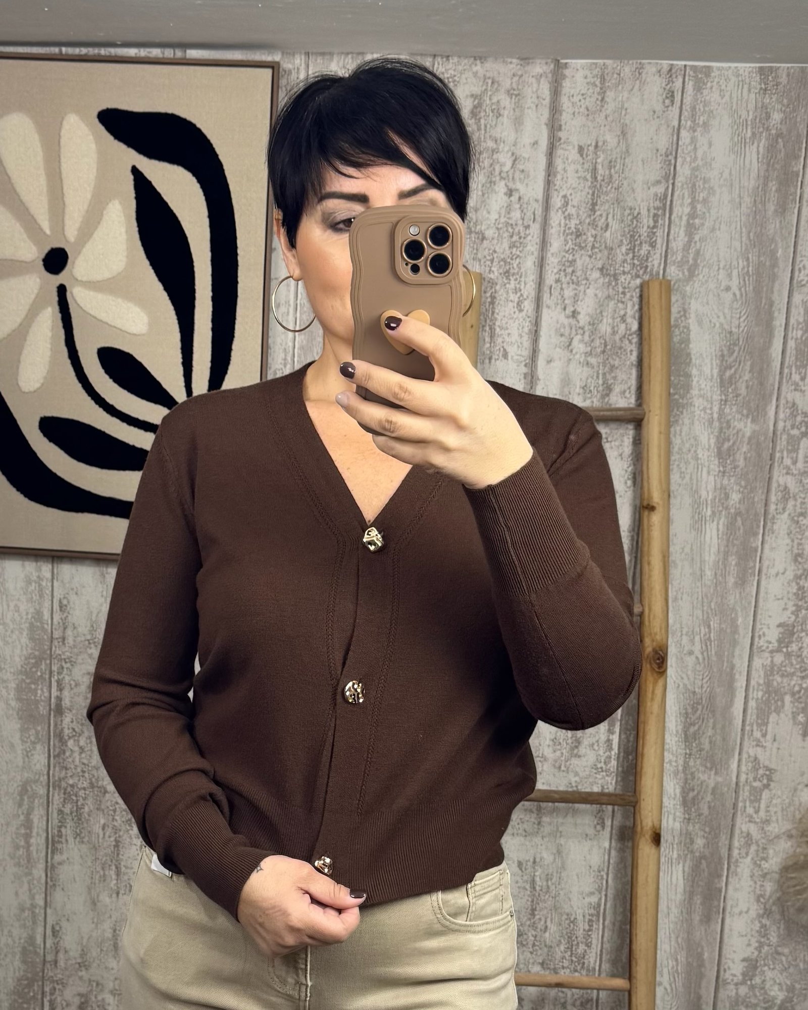 Cárdigan con la medida al pantalón o falda. Tiene tres botones joya diferentes y bonitos. Cuello en pico, ideal para llevarla cerrada estilo jersey. Talla única: abarca desde una 36 a una 42.