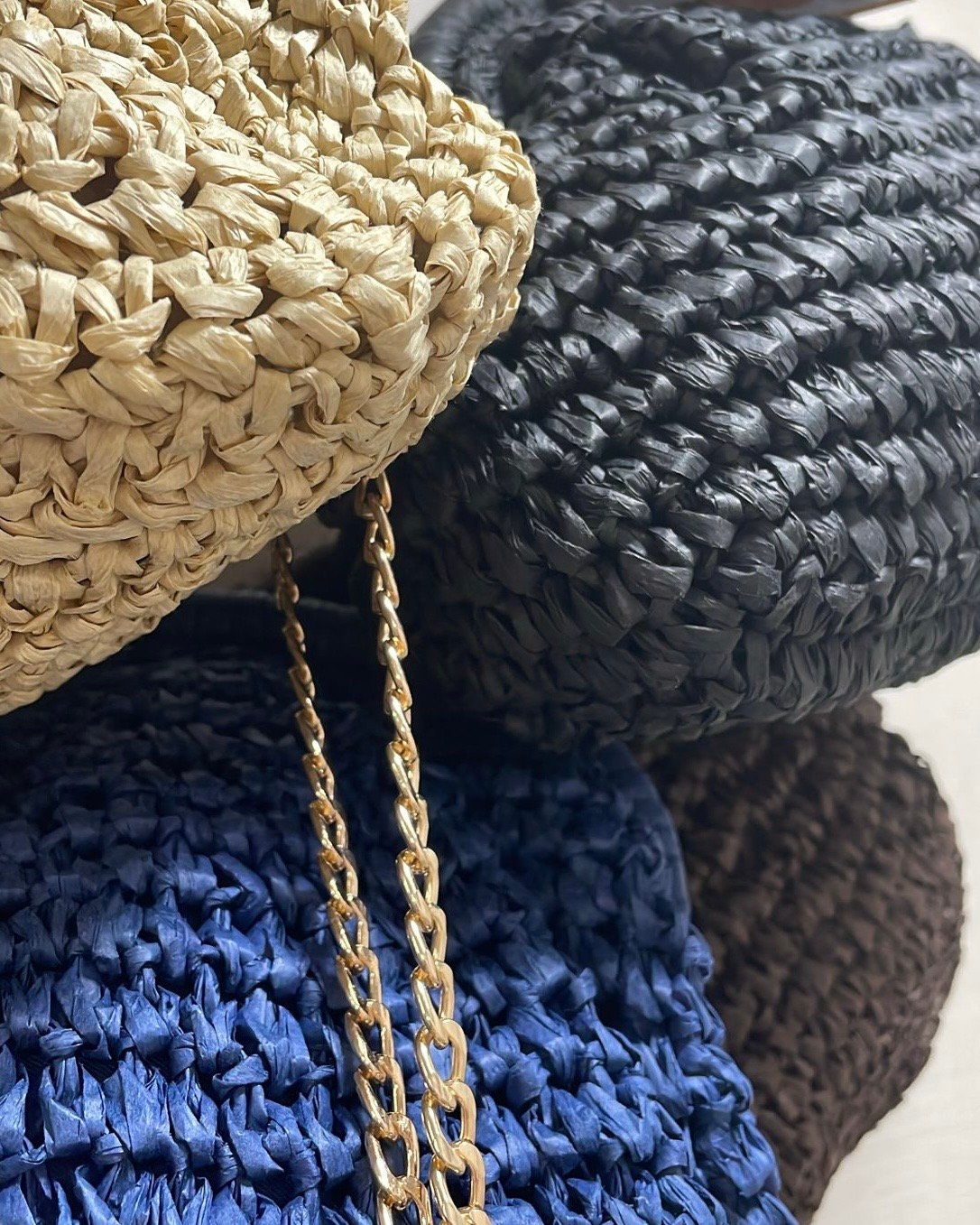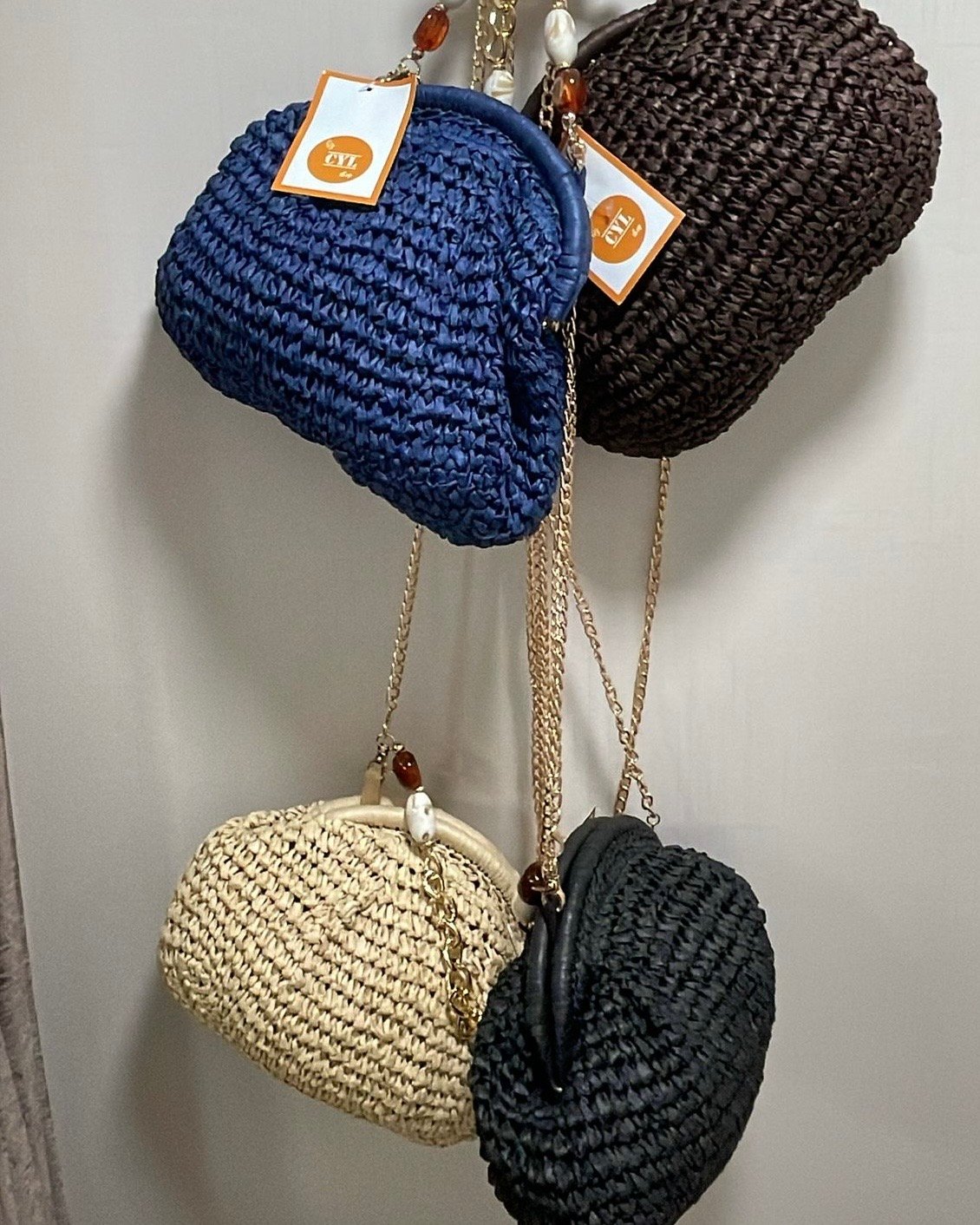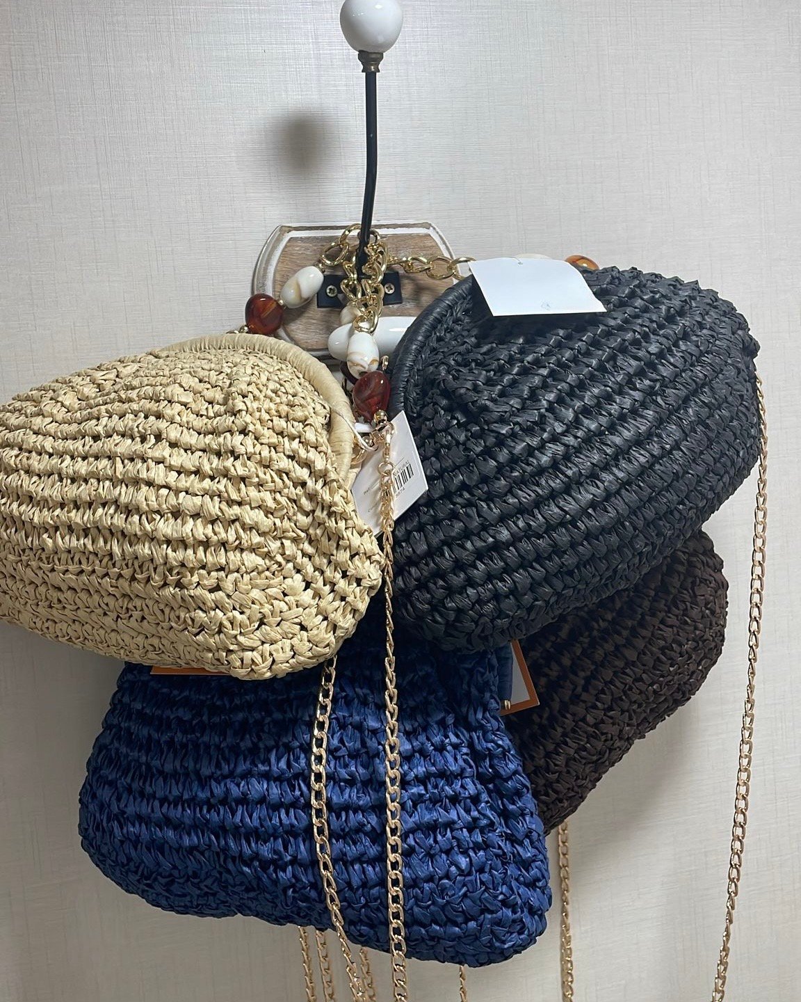 Cartera en rafia blandita. Tiene cadena corta con bolas de colores y cadena larga.
