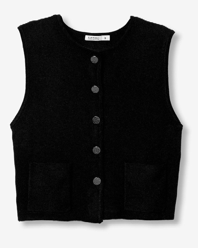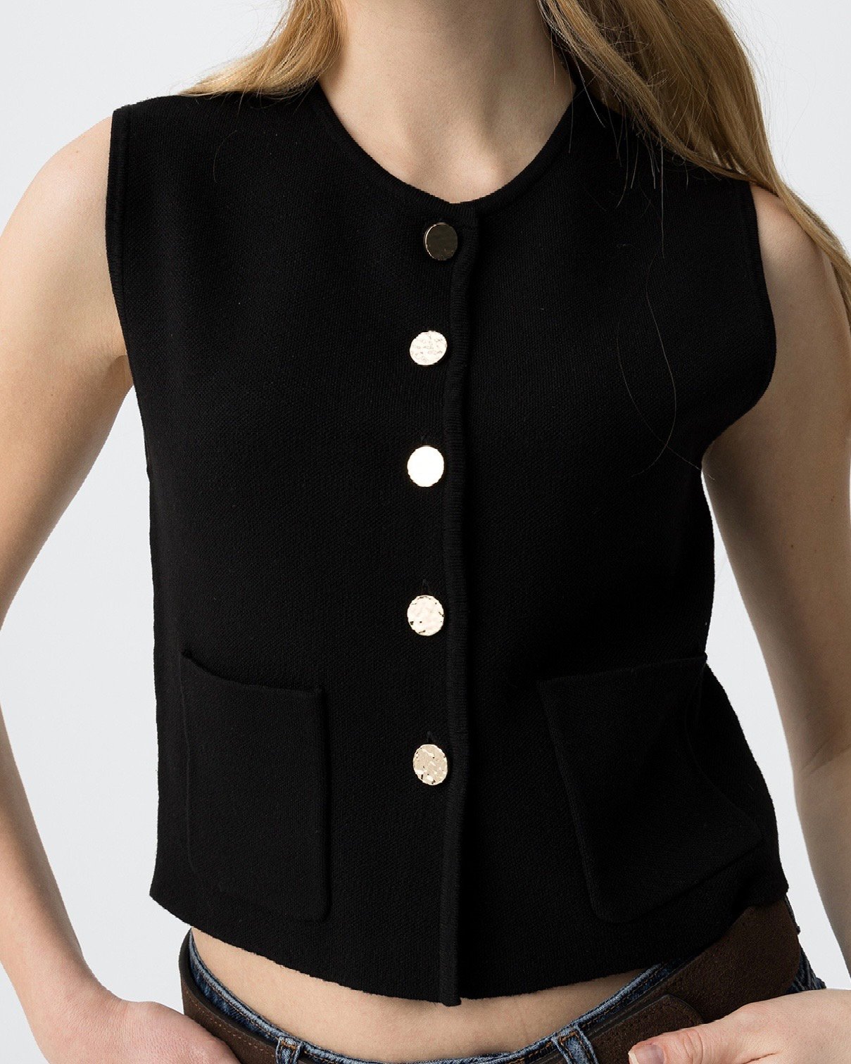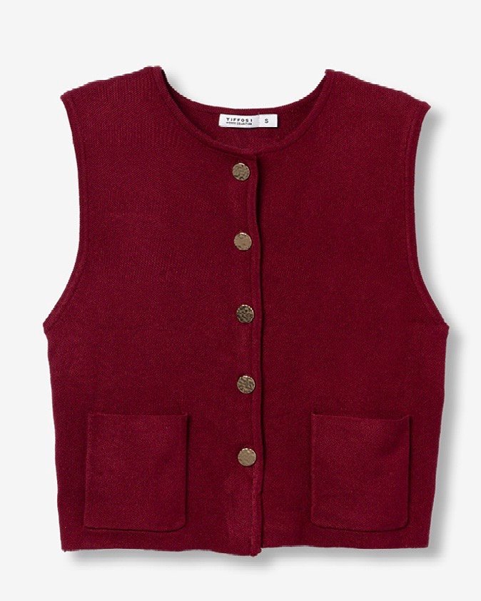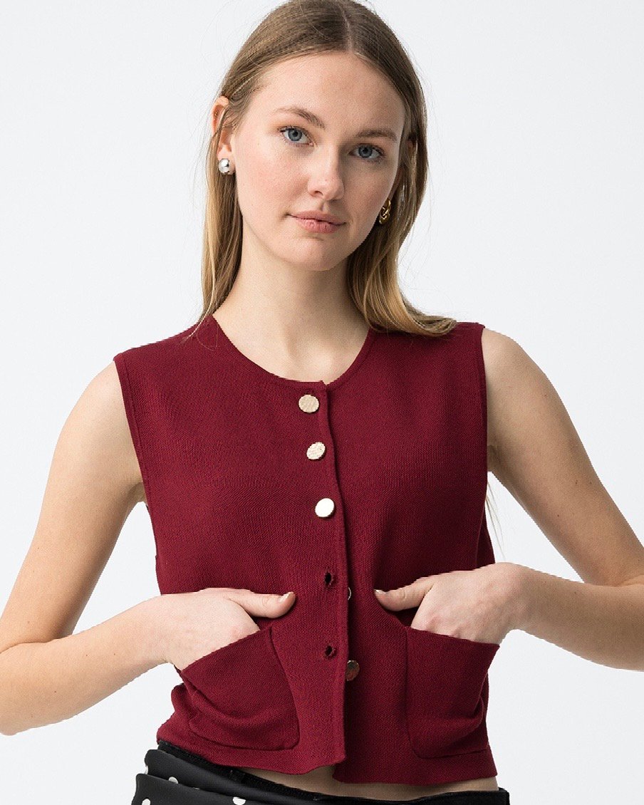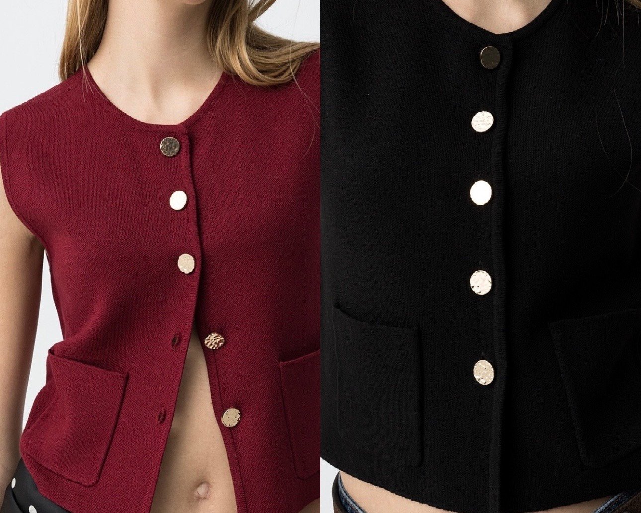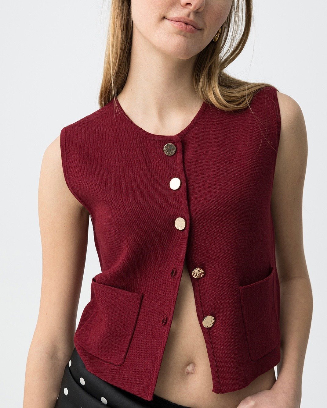 Chaleco de punto con botones dorados en el color granate y plateados en el negro.