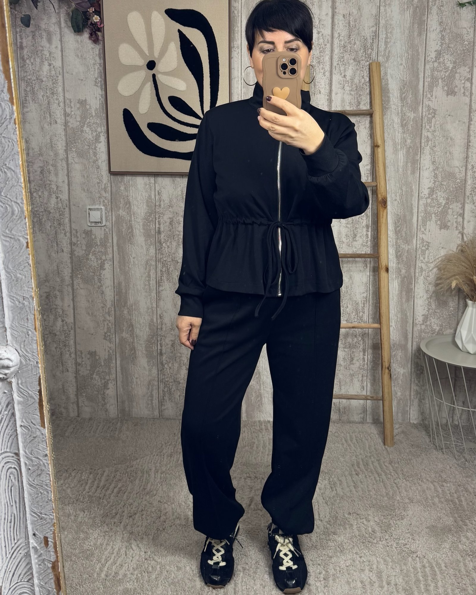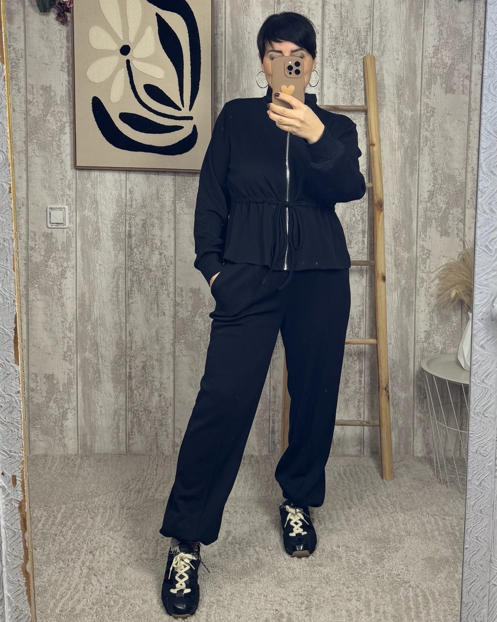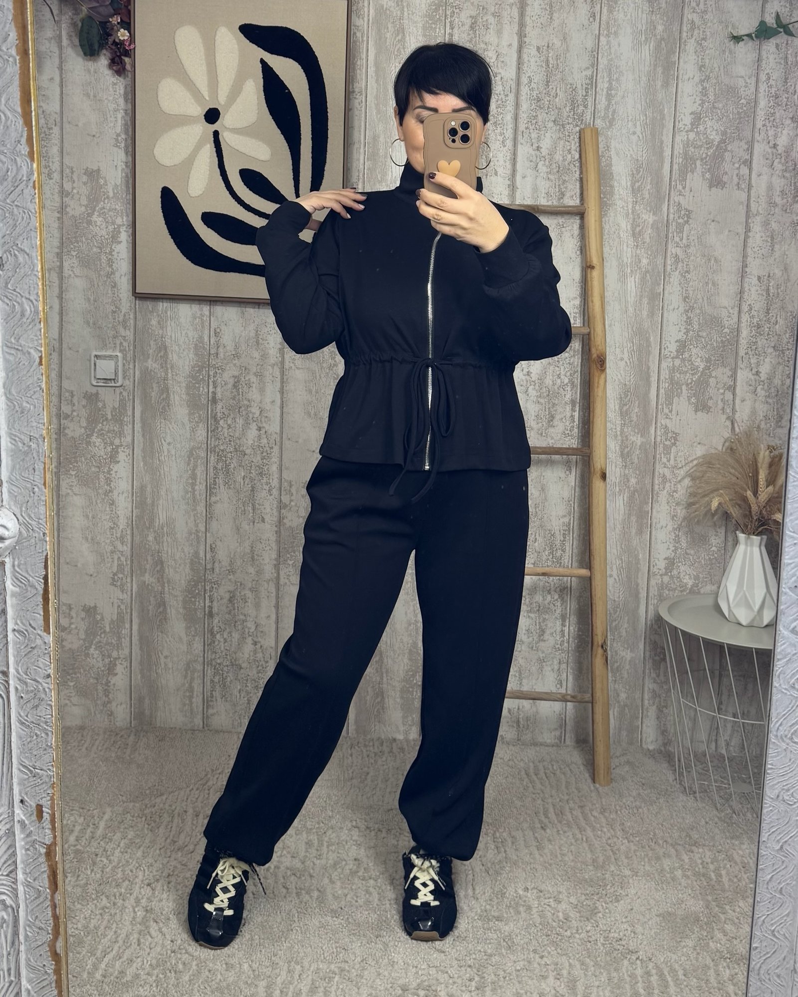 Dos piezas con tejido de capa de aire en color negro, rizado el la parte de la cintura y cremallera en la chaqueta. Talla única: abarca de la 36 a la 42.