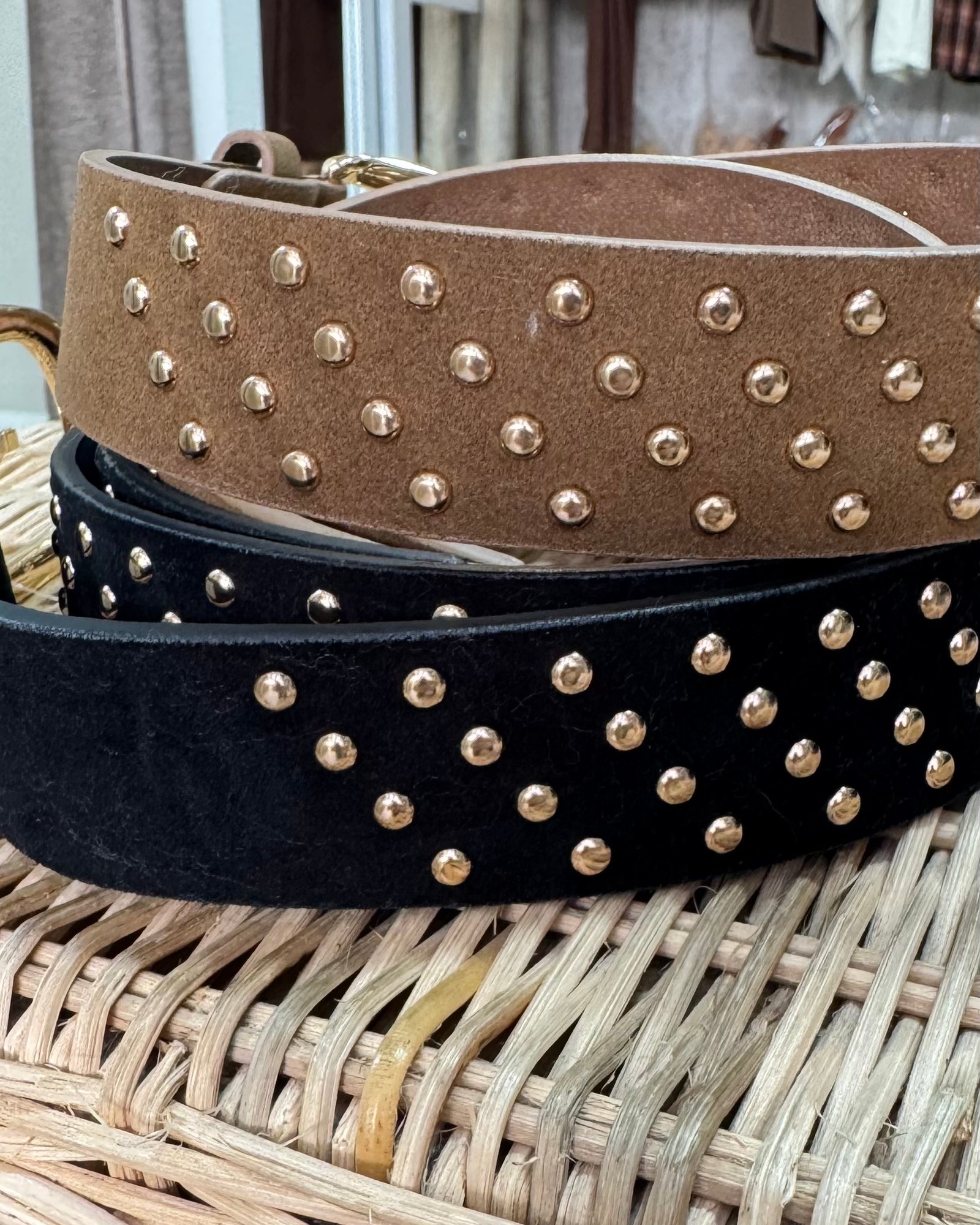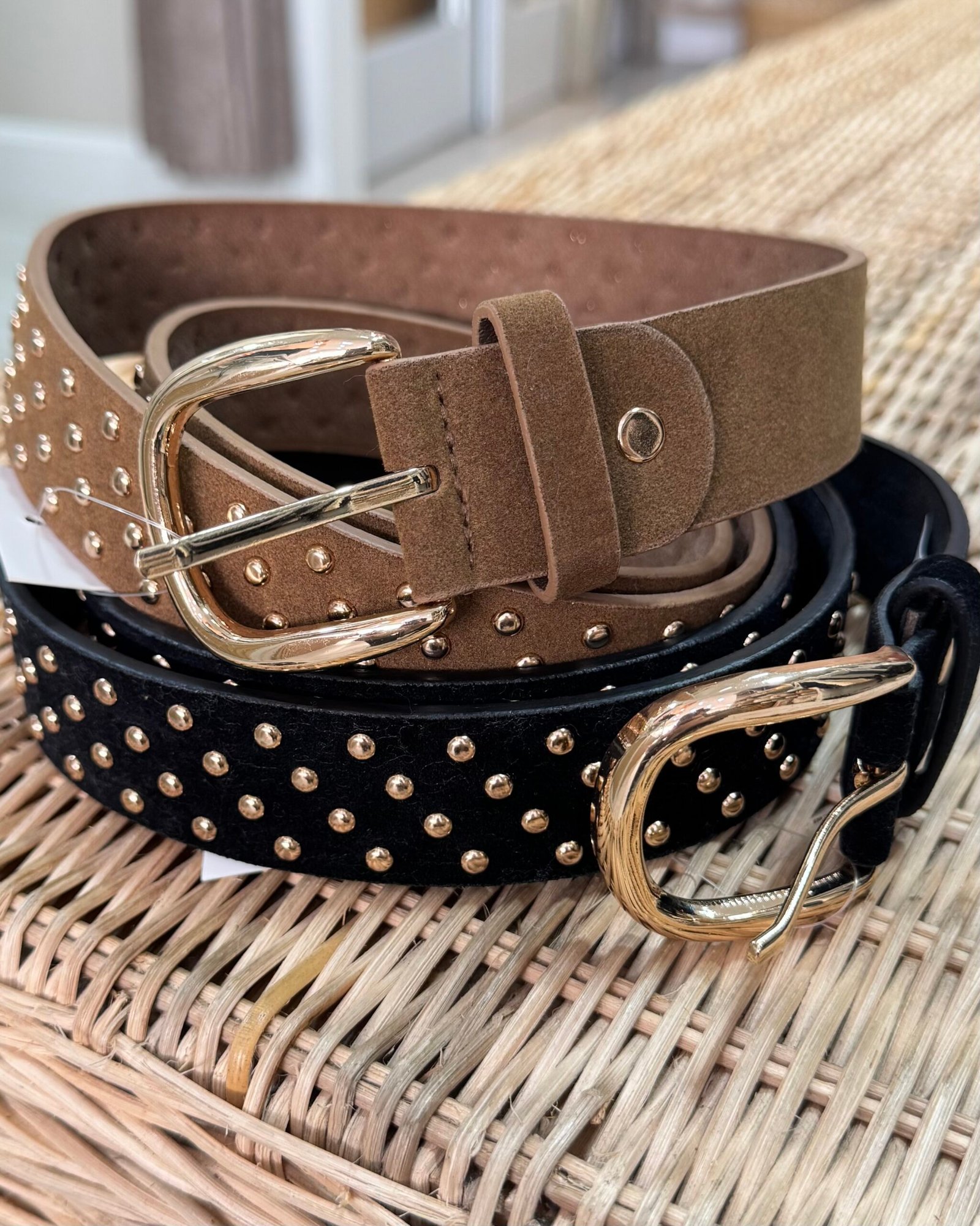 Cinturón con tachas en dorado y hebilla en dorado.