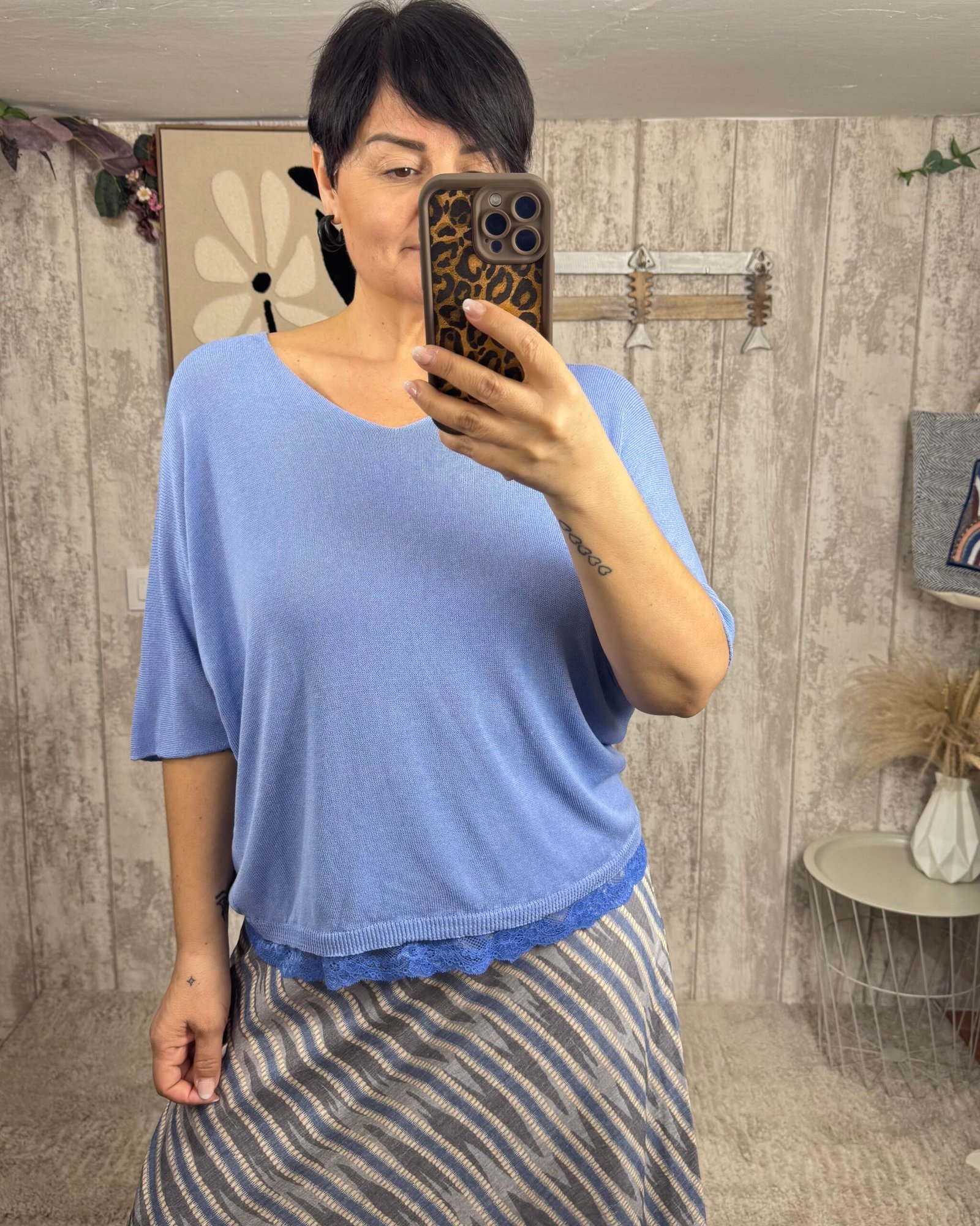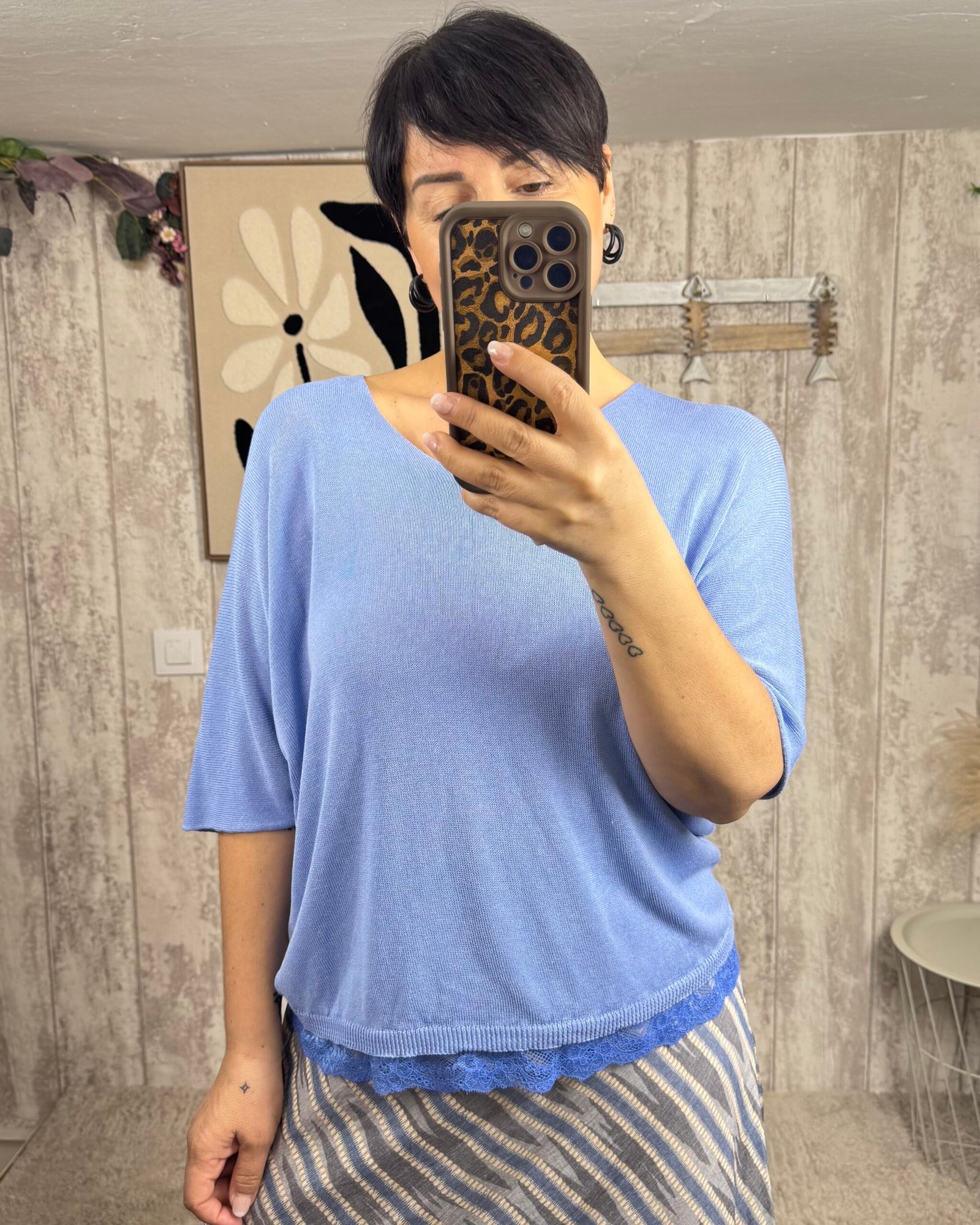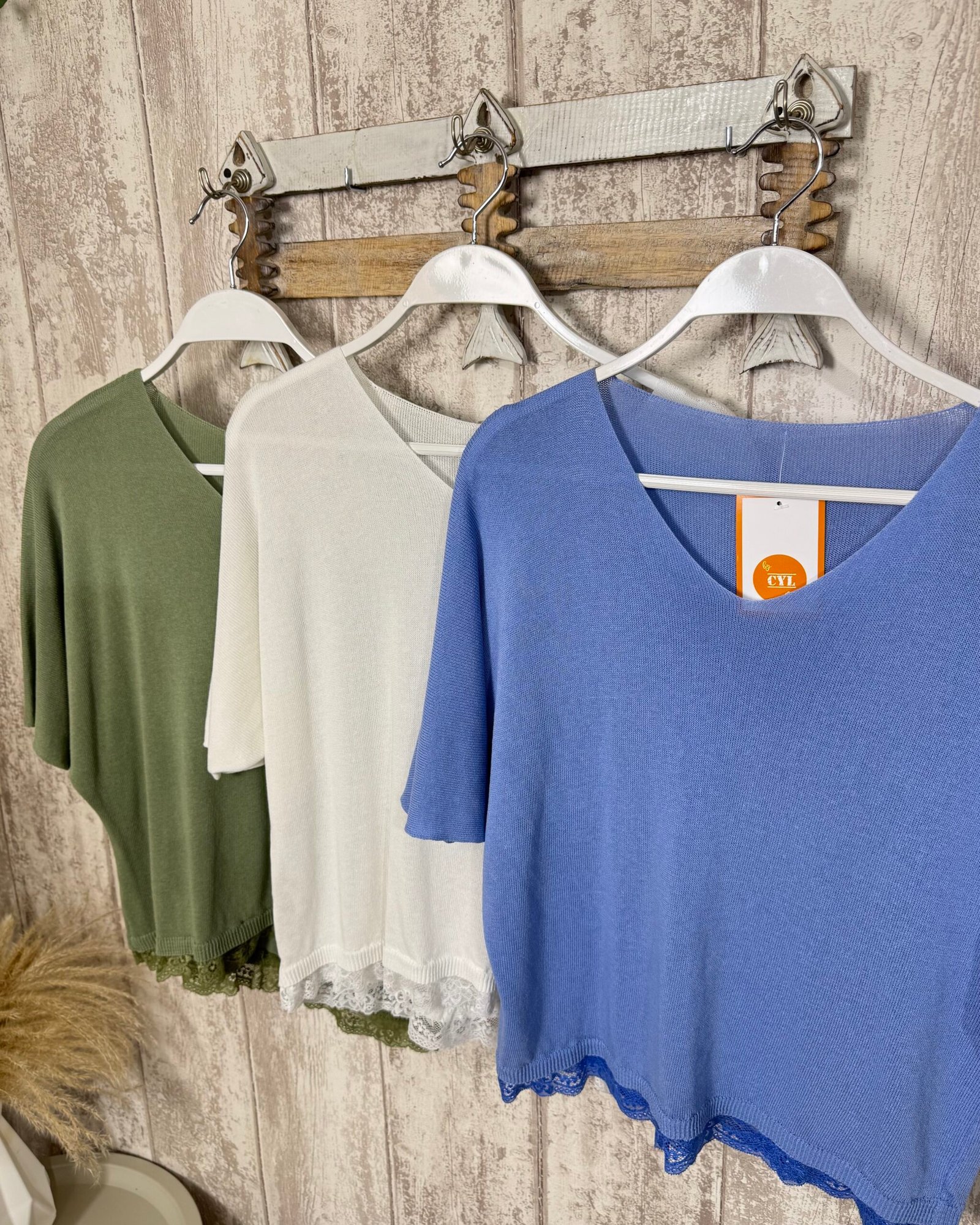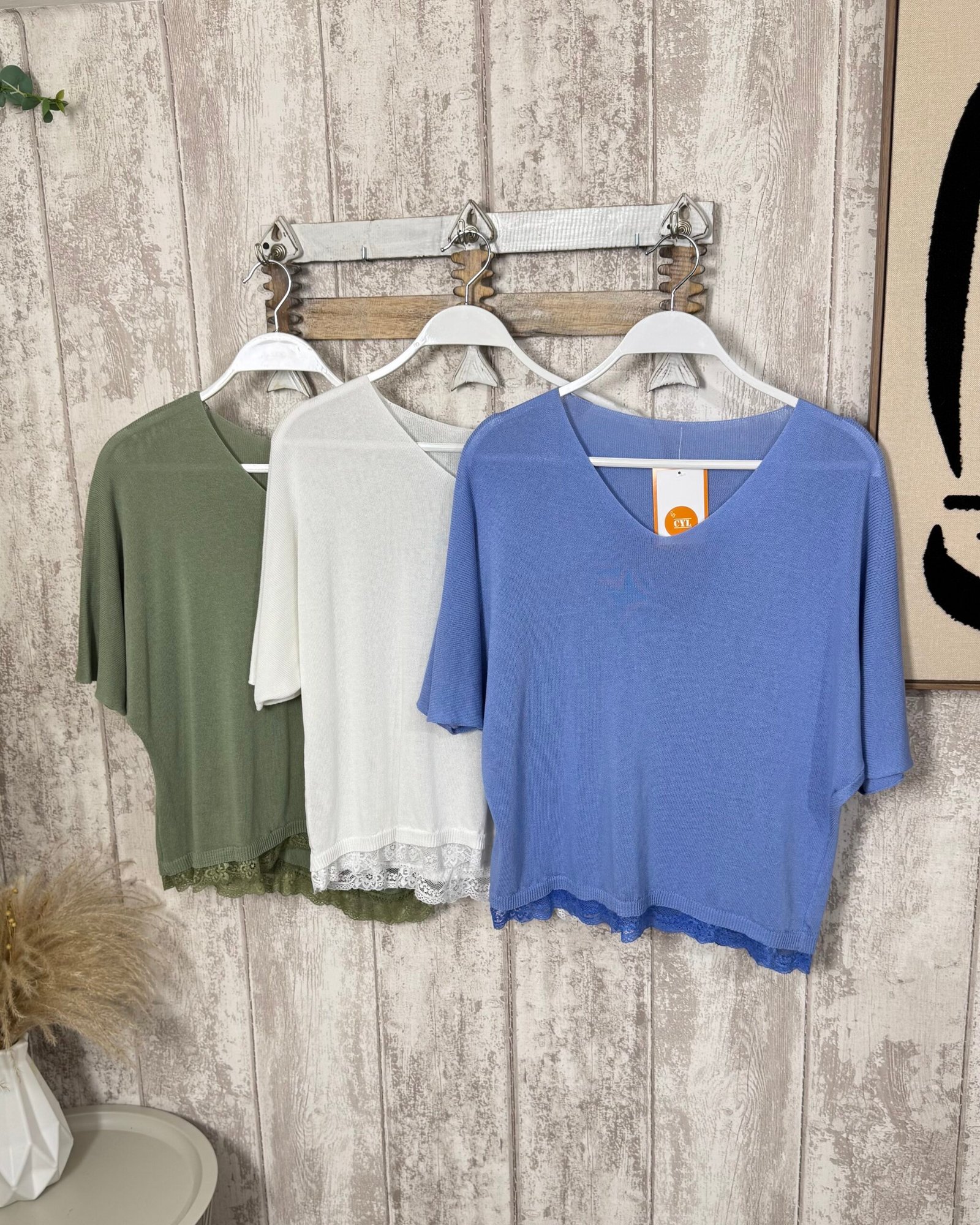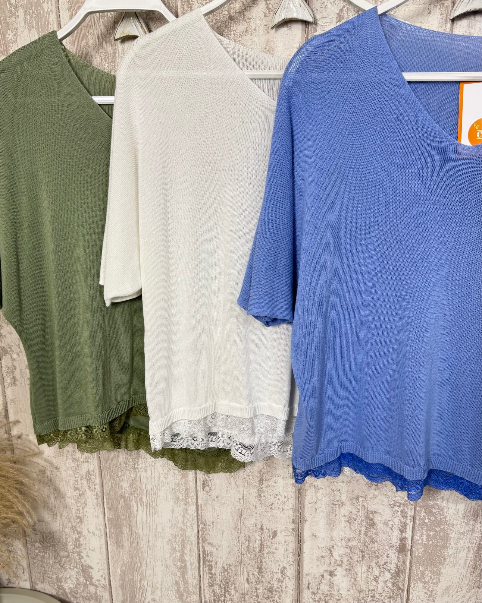 Jersey de hijo finito de manga al codo y encaje en el bajo.