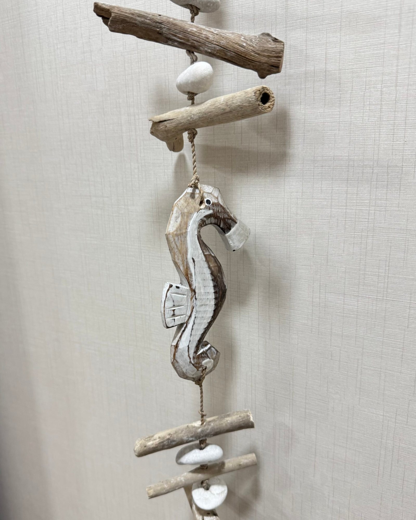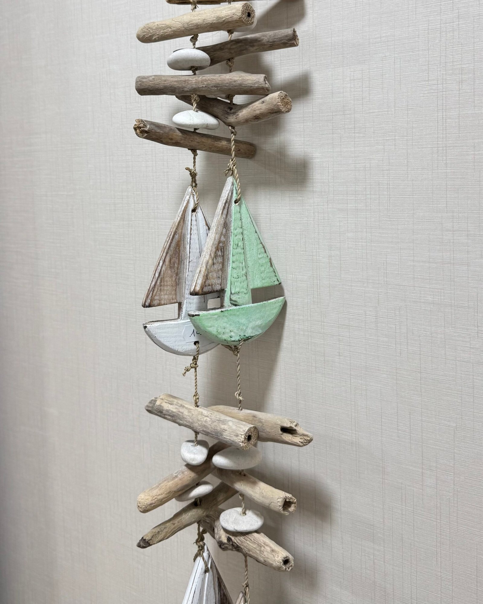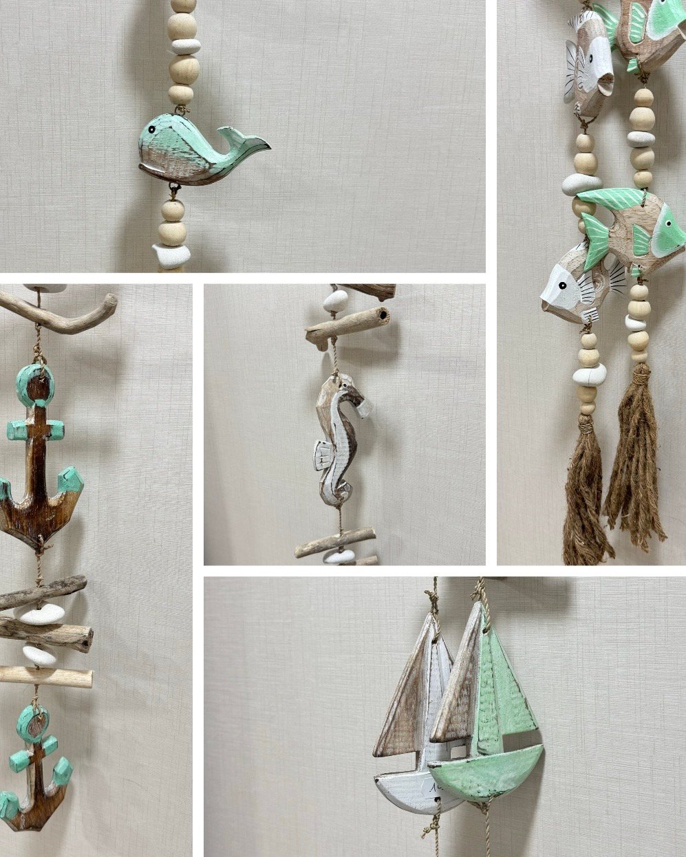 Móviles de madera, rafia y cuerda con motivos marítimos.