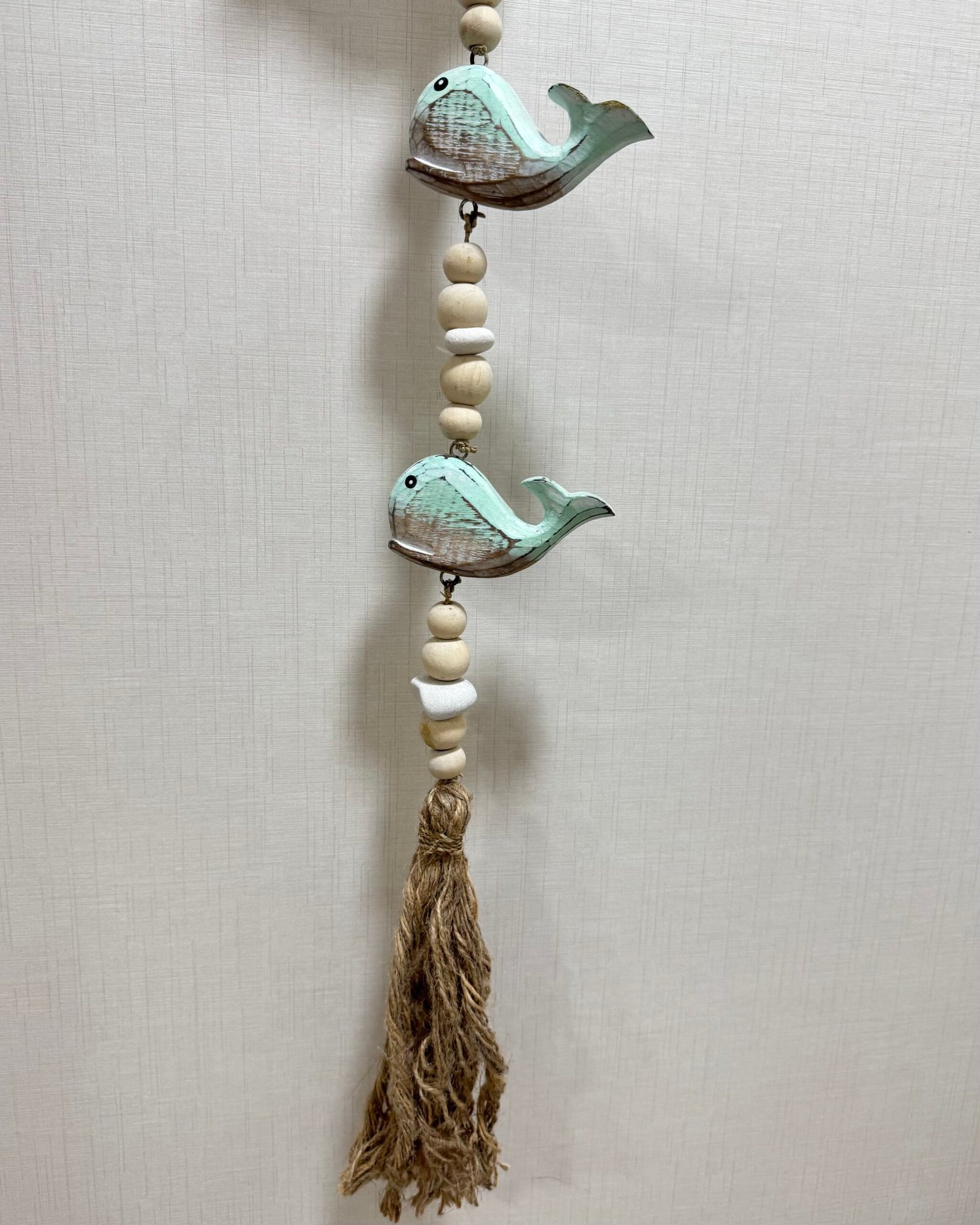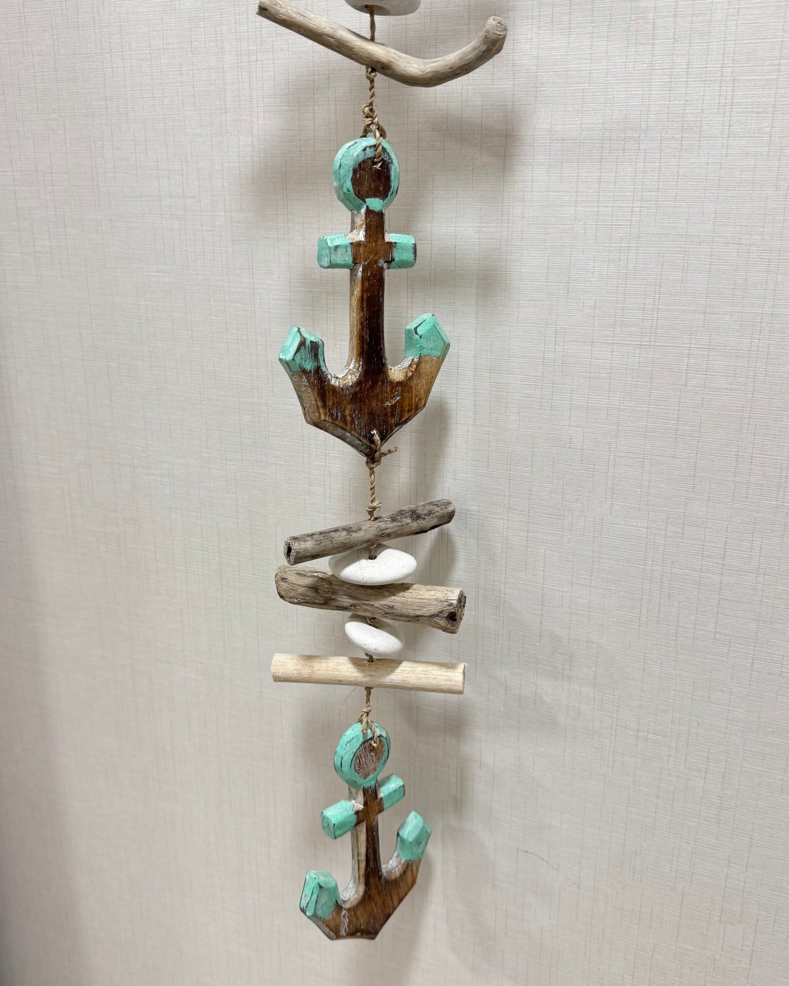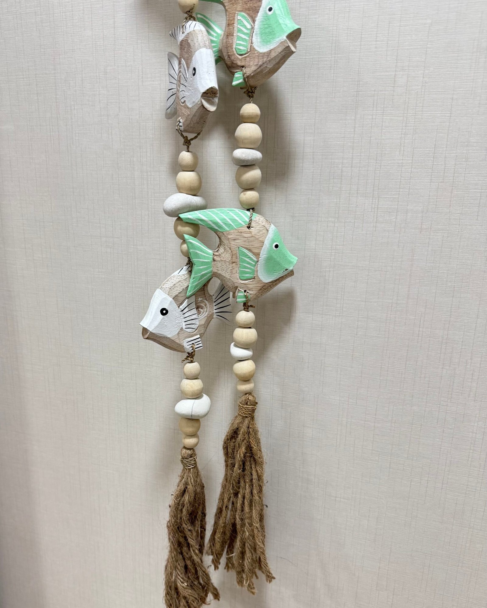 Móviles de madera, rafia y cuerda con motivos marítimos.