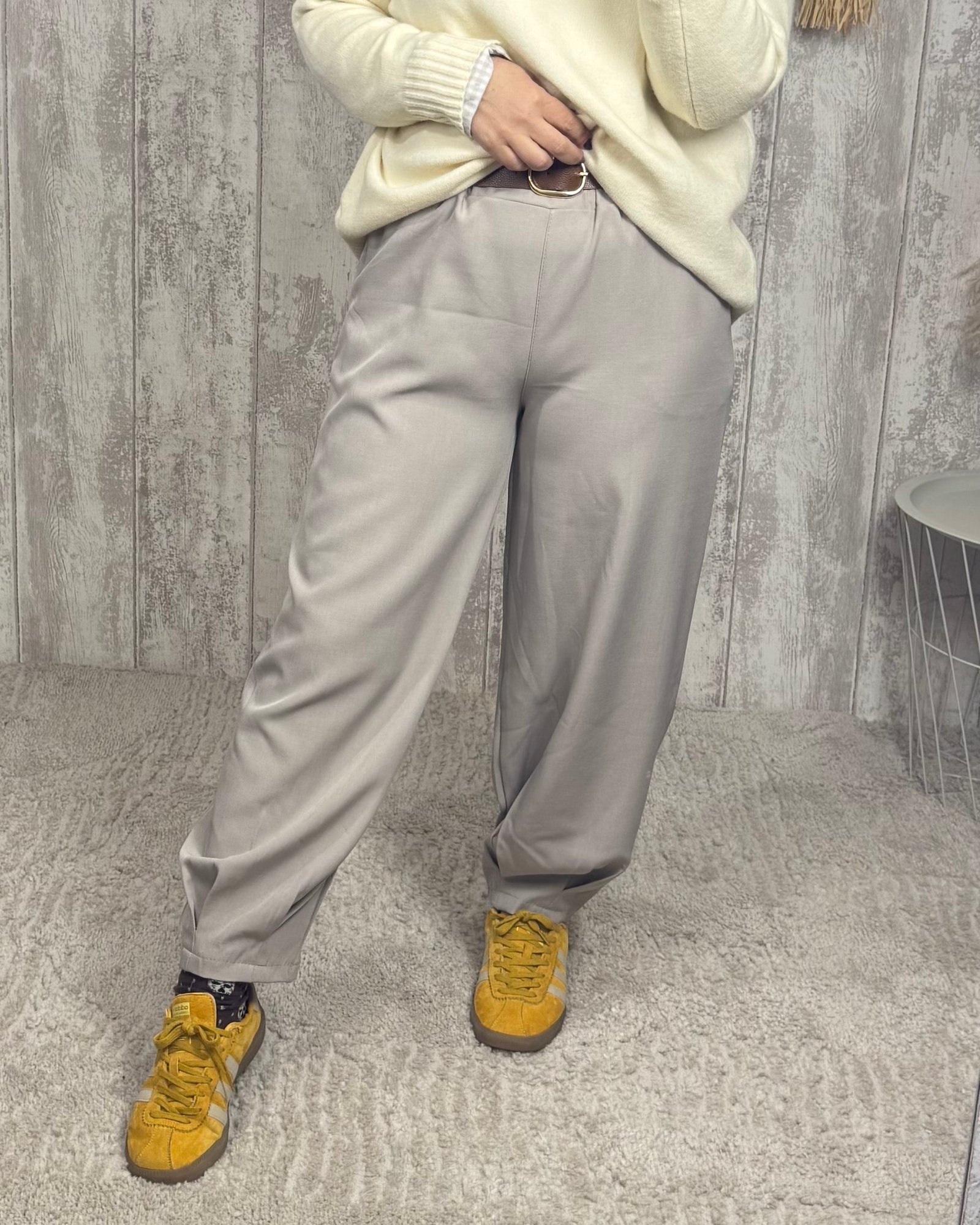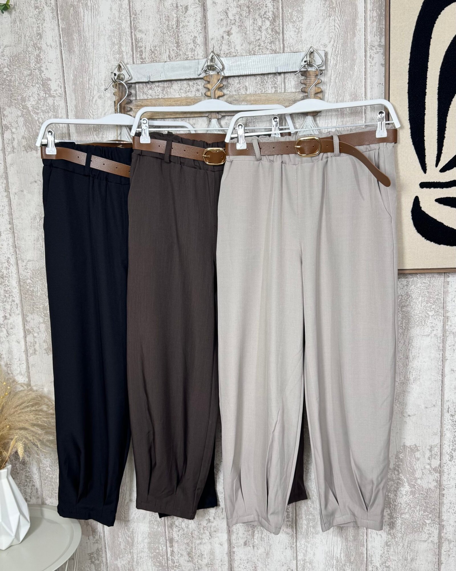 Pantalón con corte balloon no muy marcado, en tres colores e incluye el cinturón.