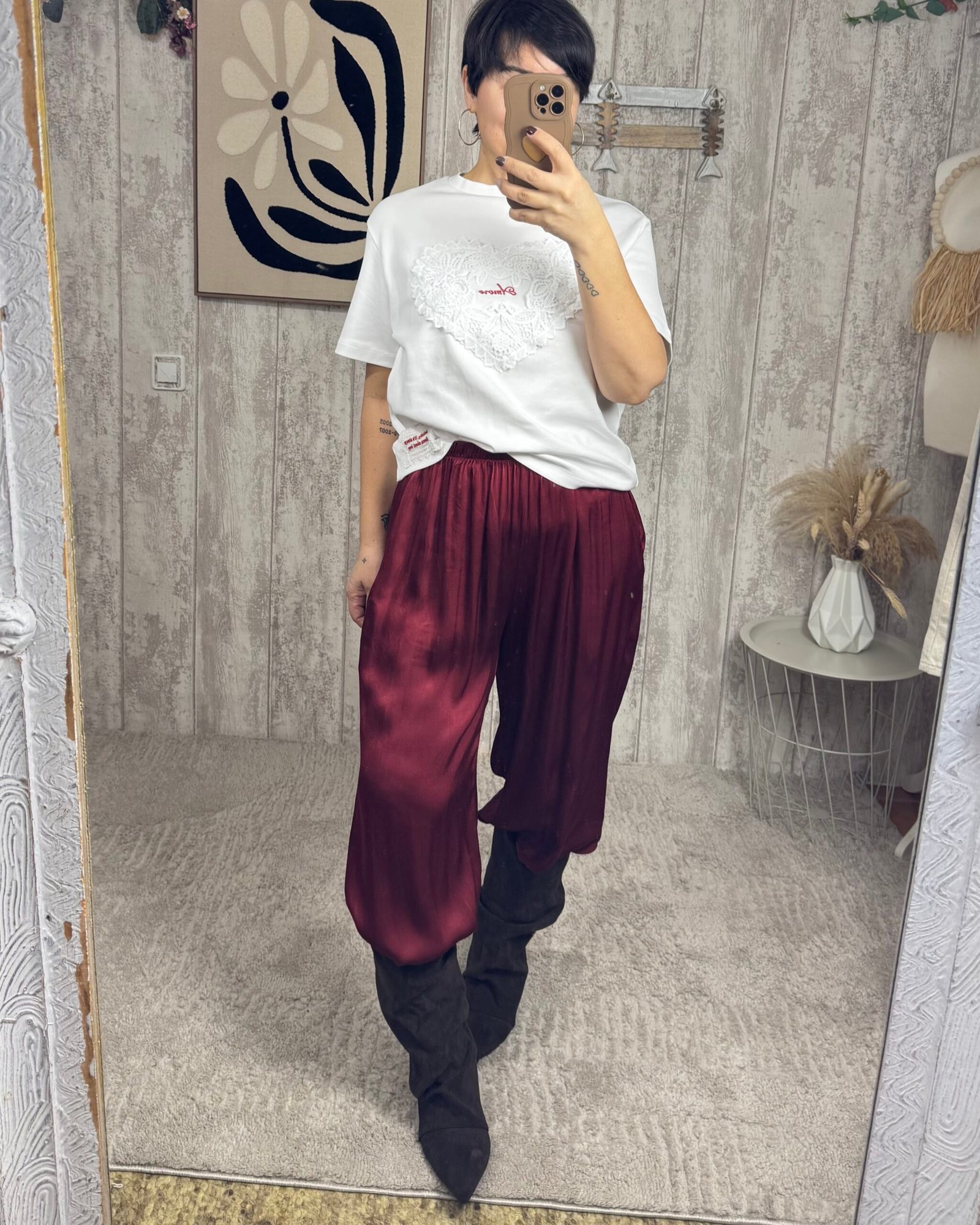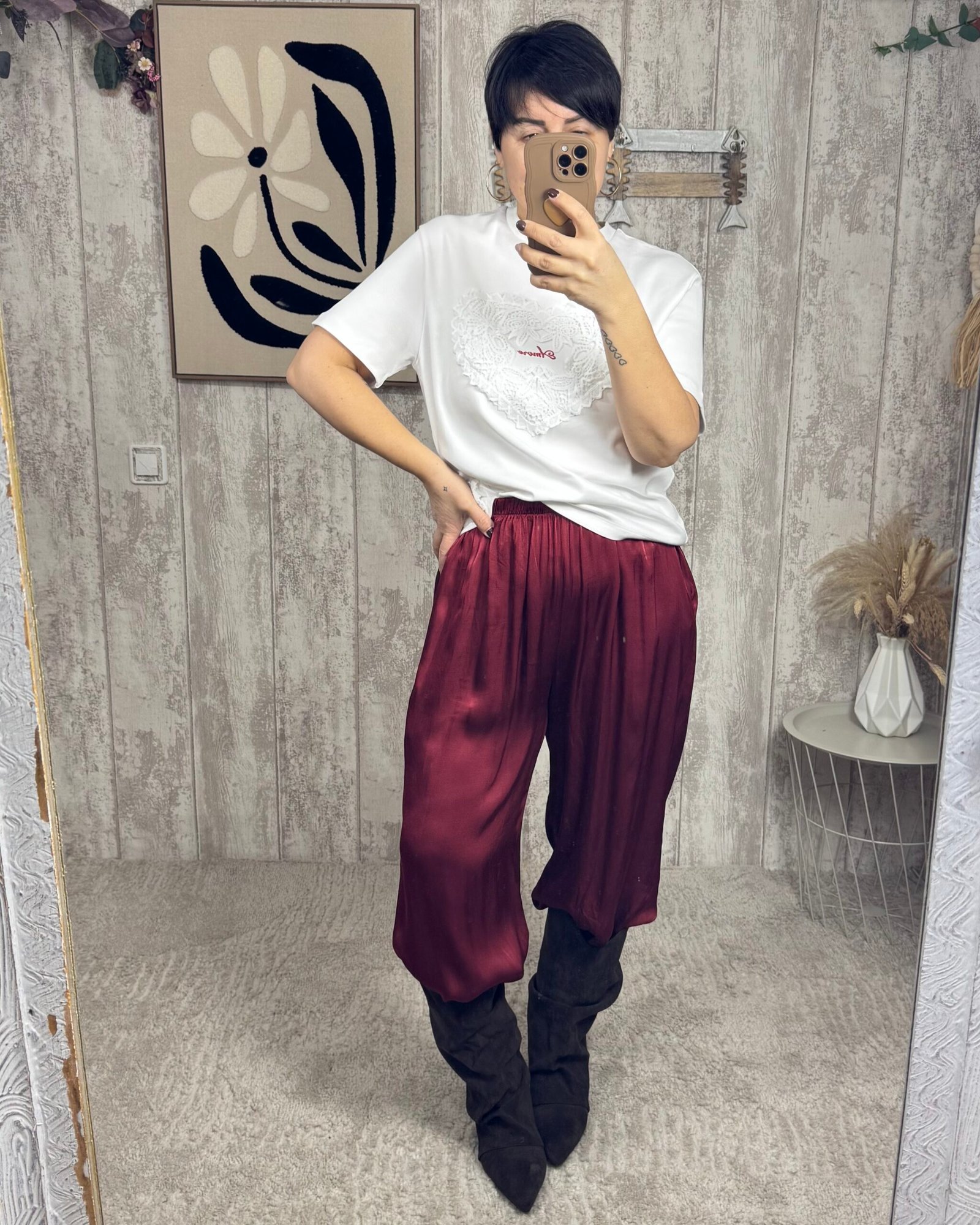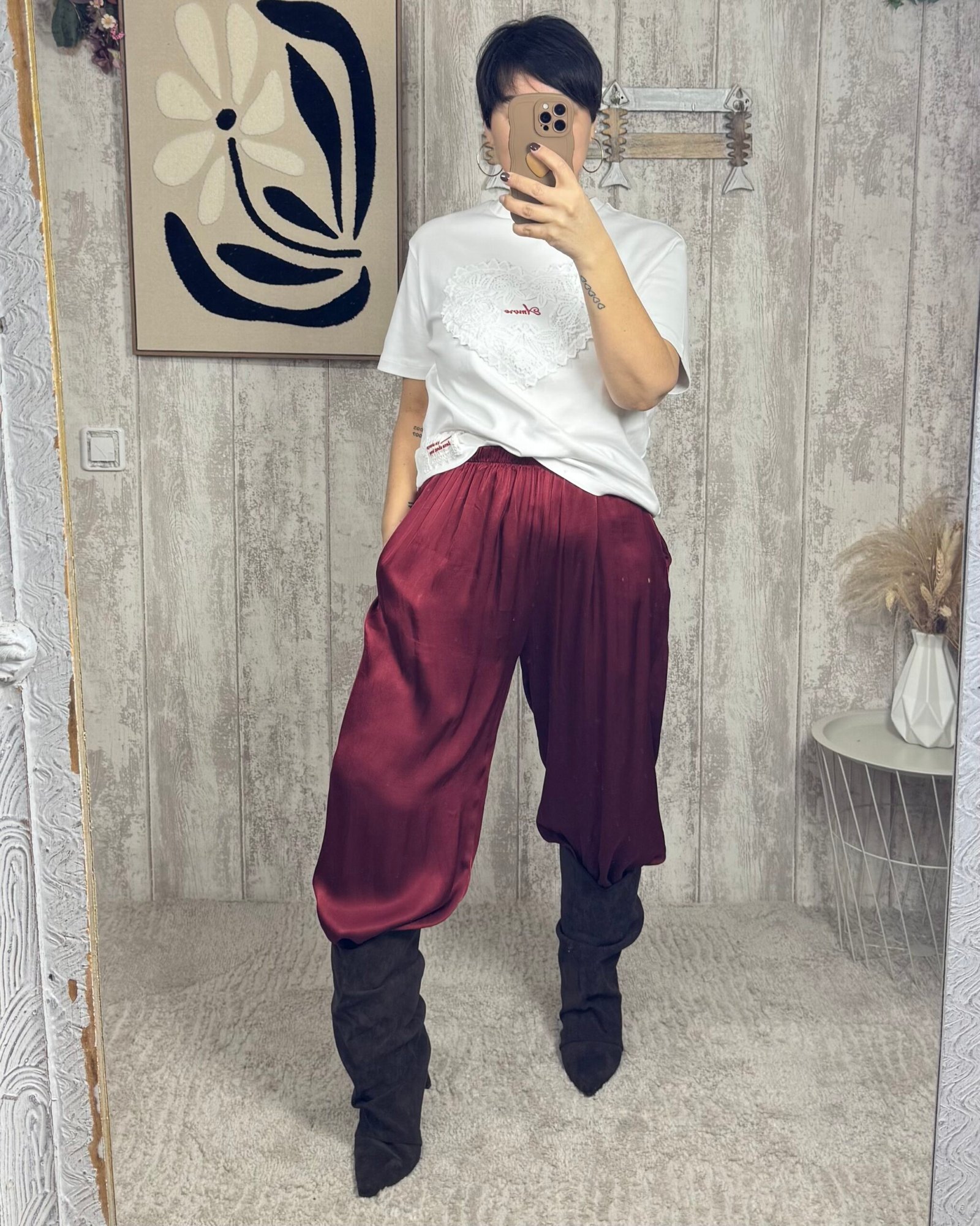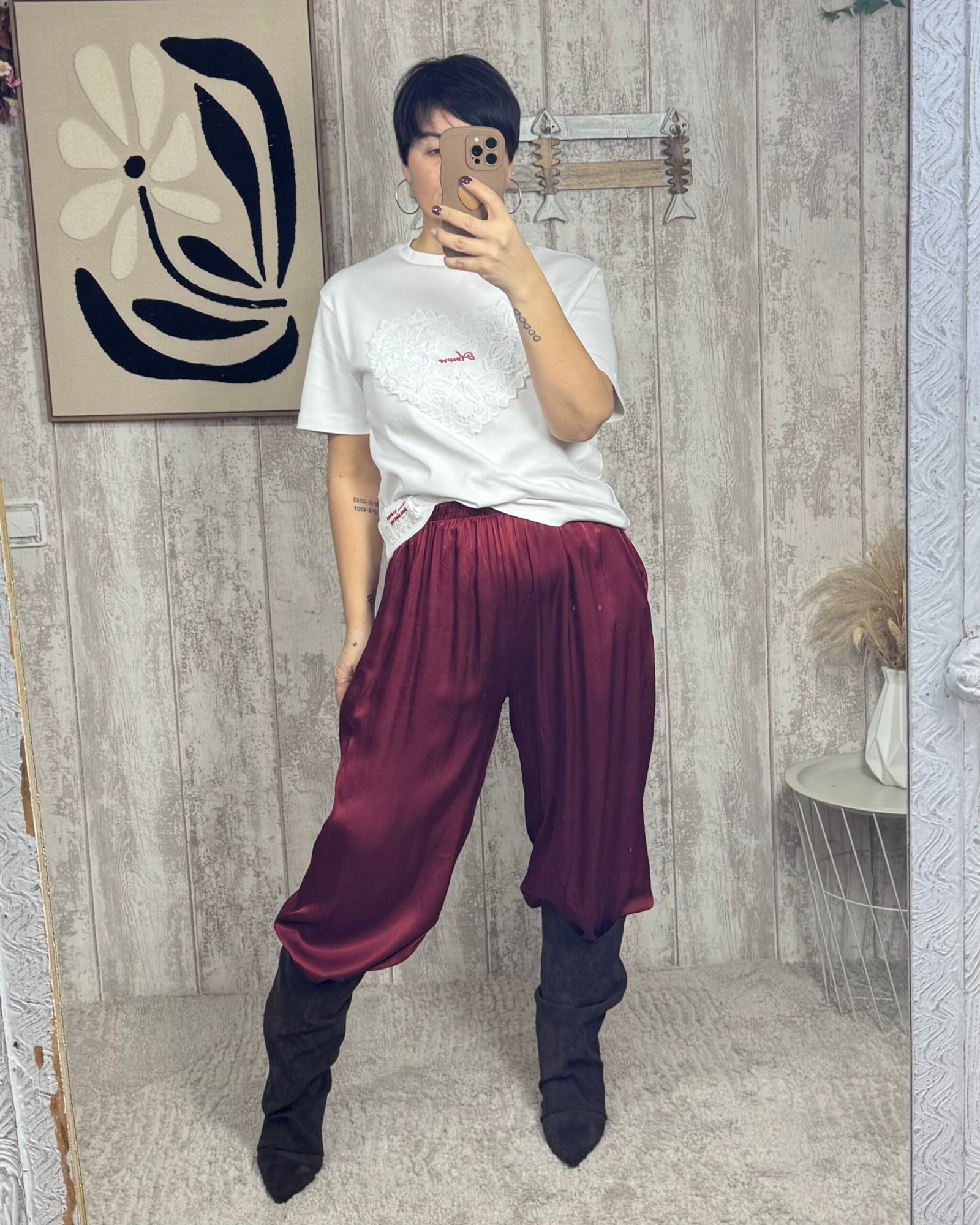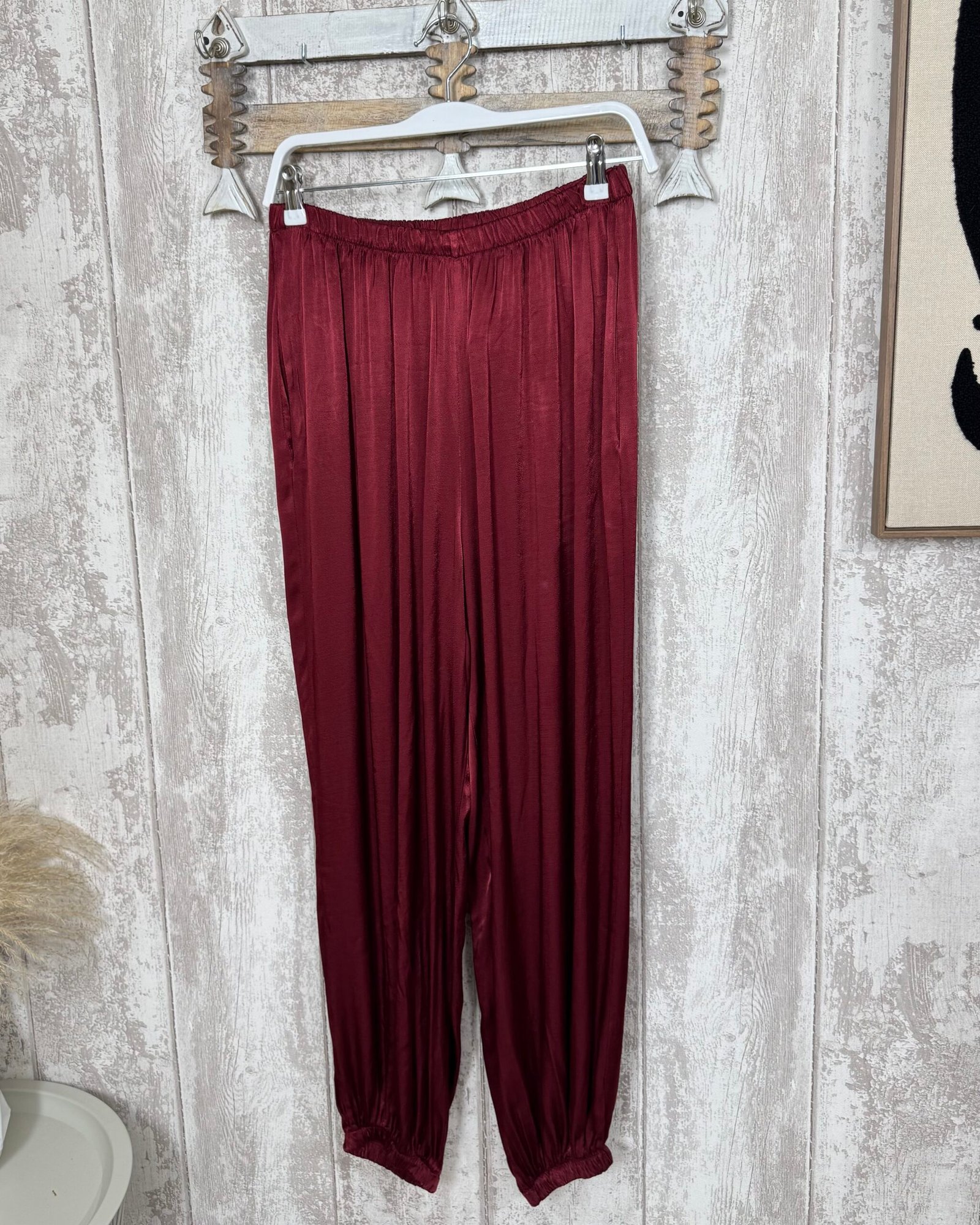 Pantalón bombacho, con goma en el bajo, satinado en color granate.