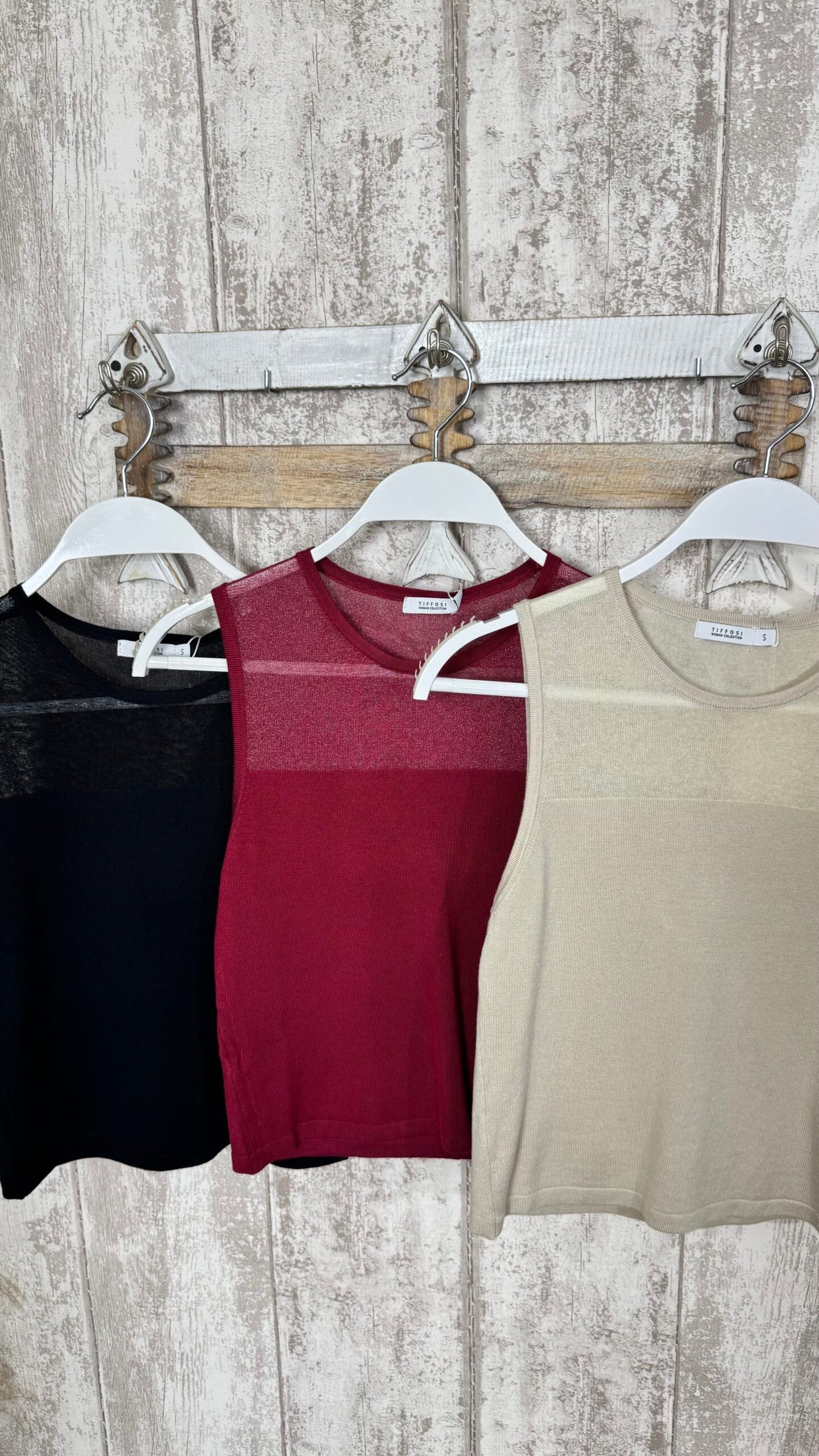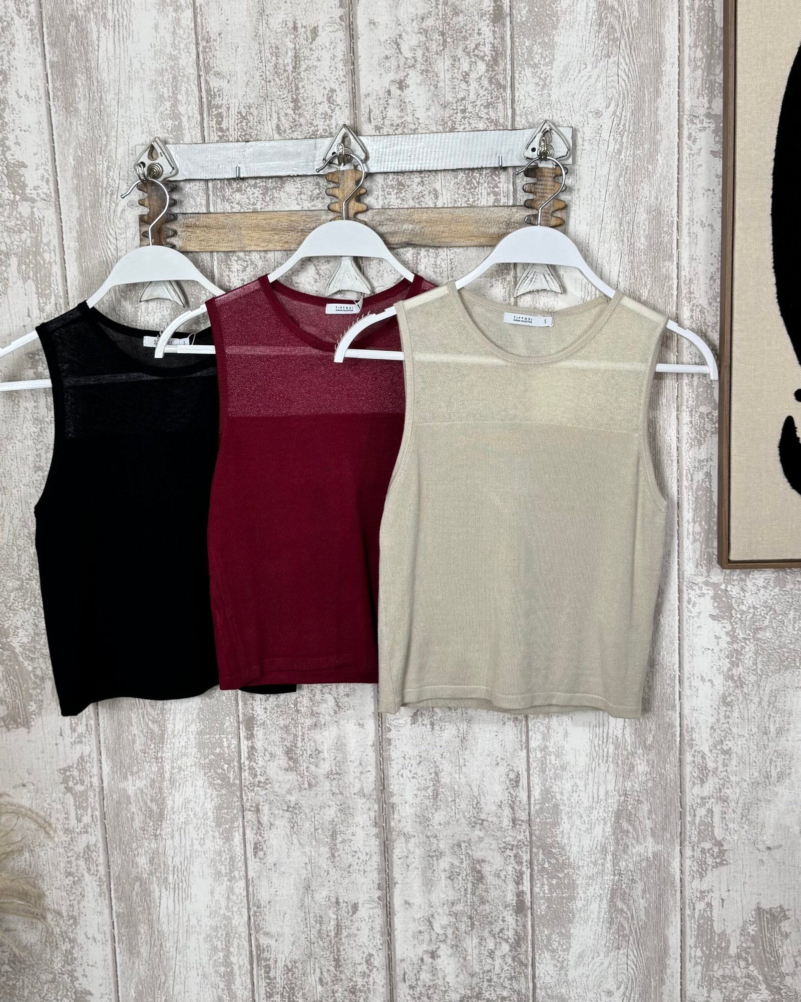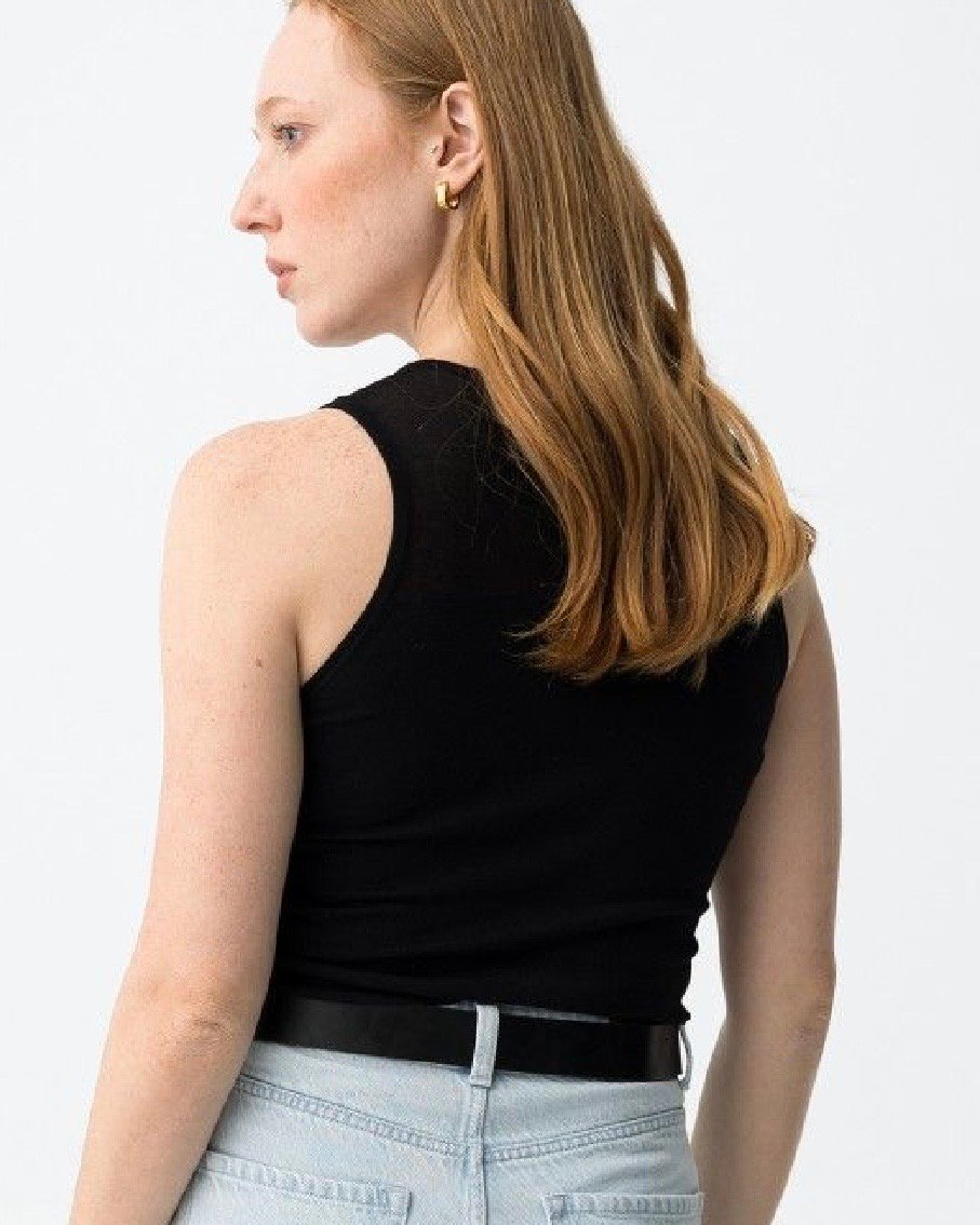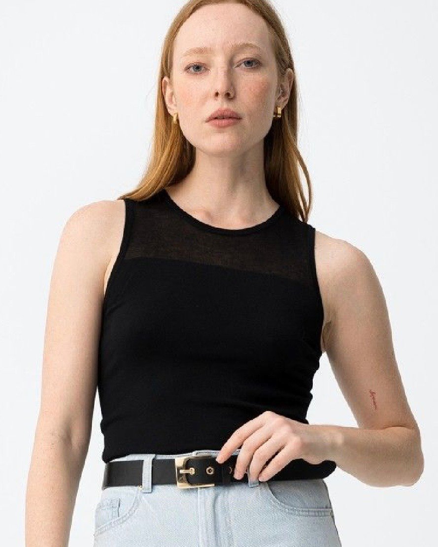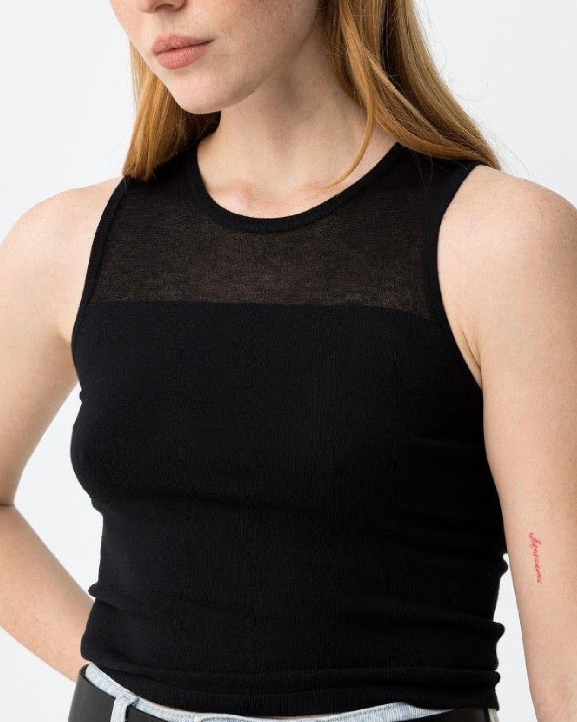 Top de algodón con la parte del pecho transparente. Manga sisa.