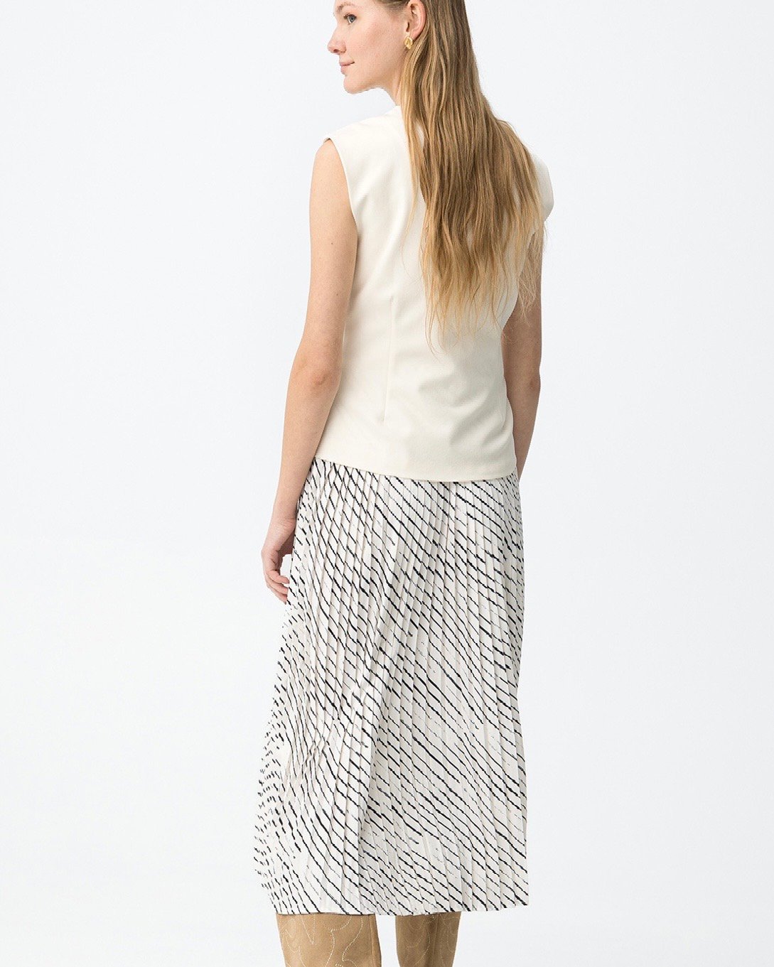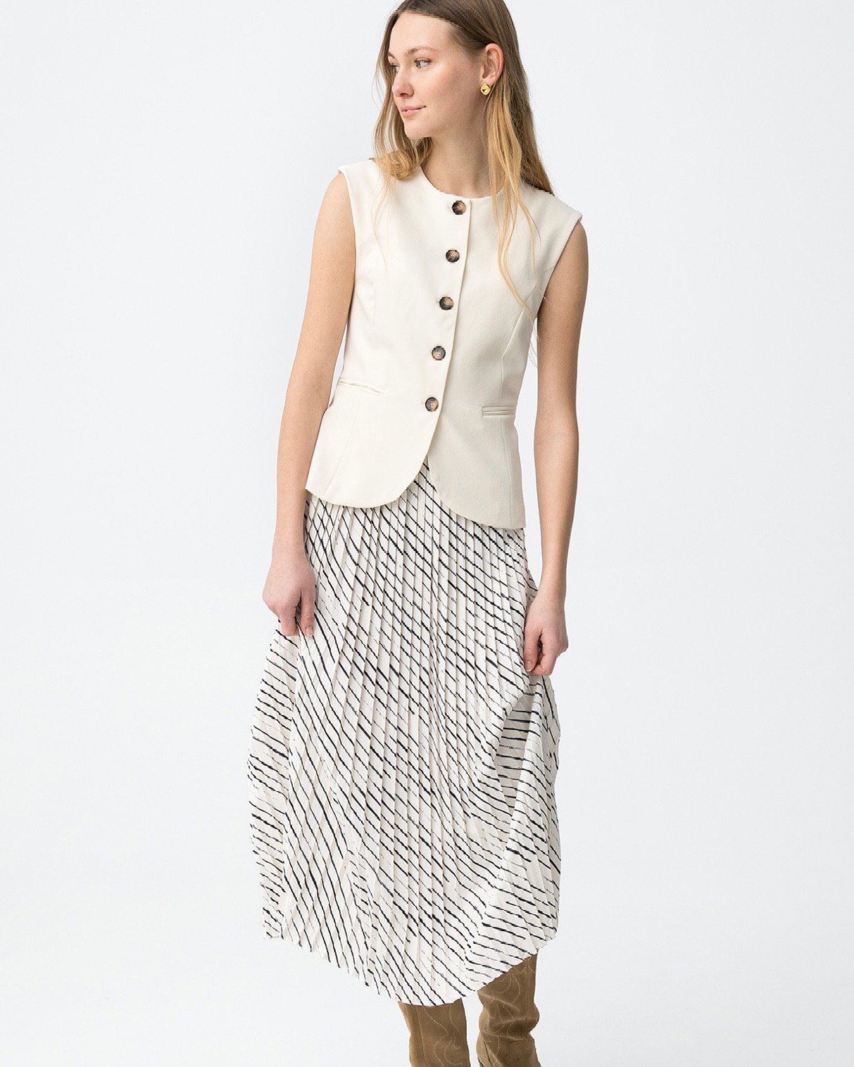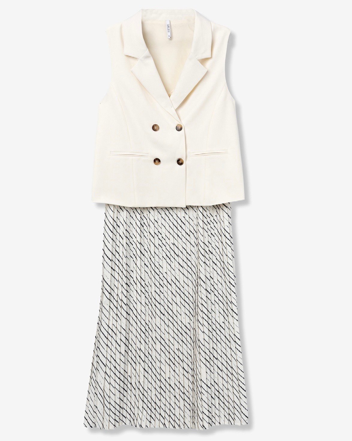 Vestido formado por dos partes: chaleco y vestido de tirantes debajo. La parte de la falda plisada.