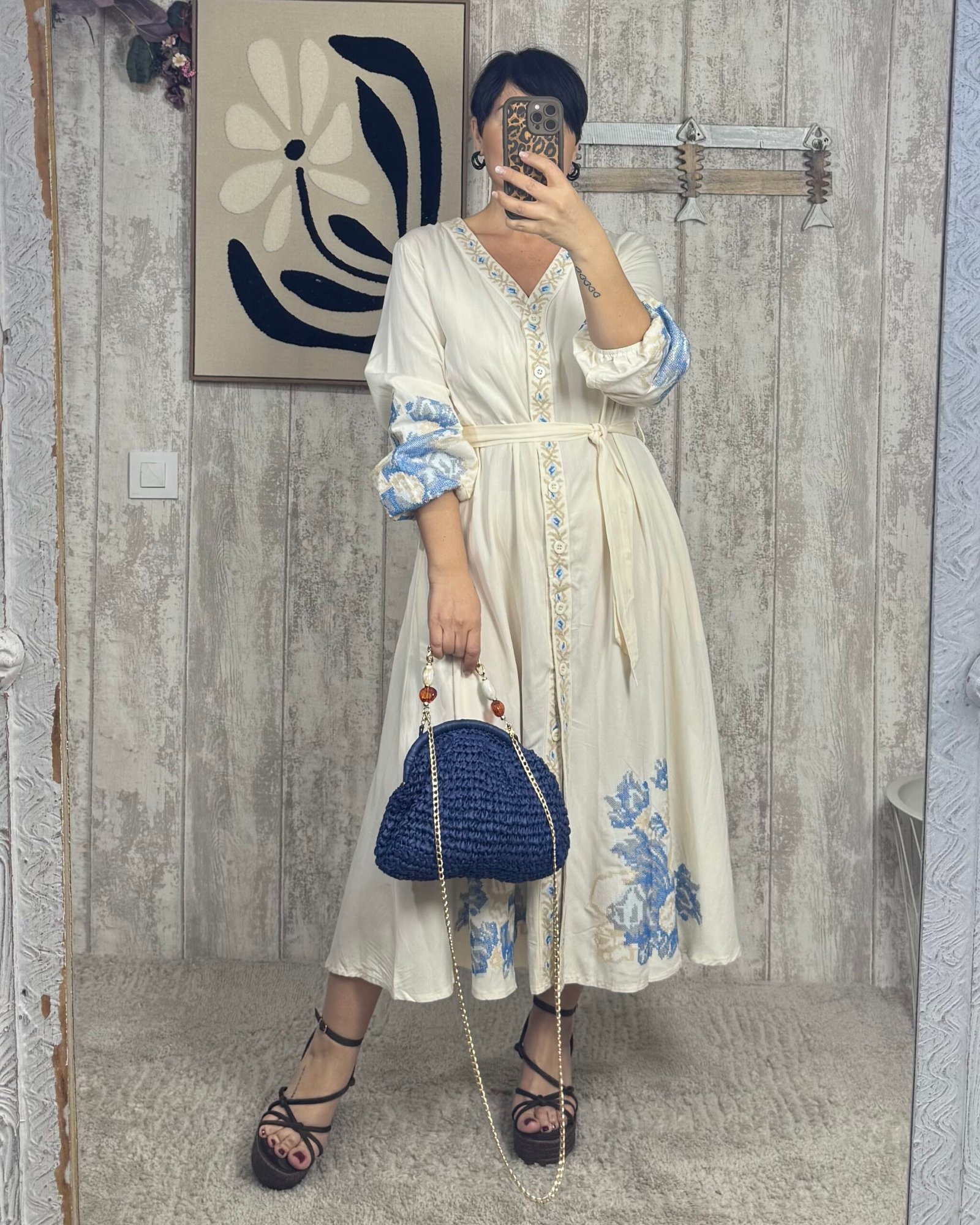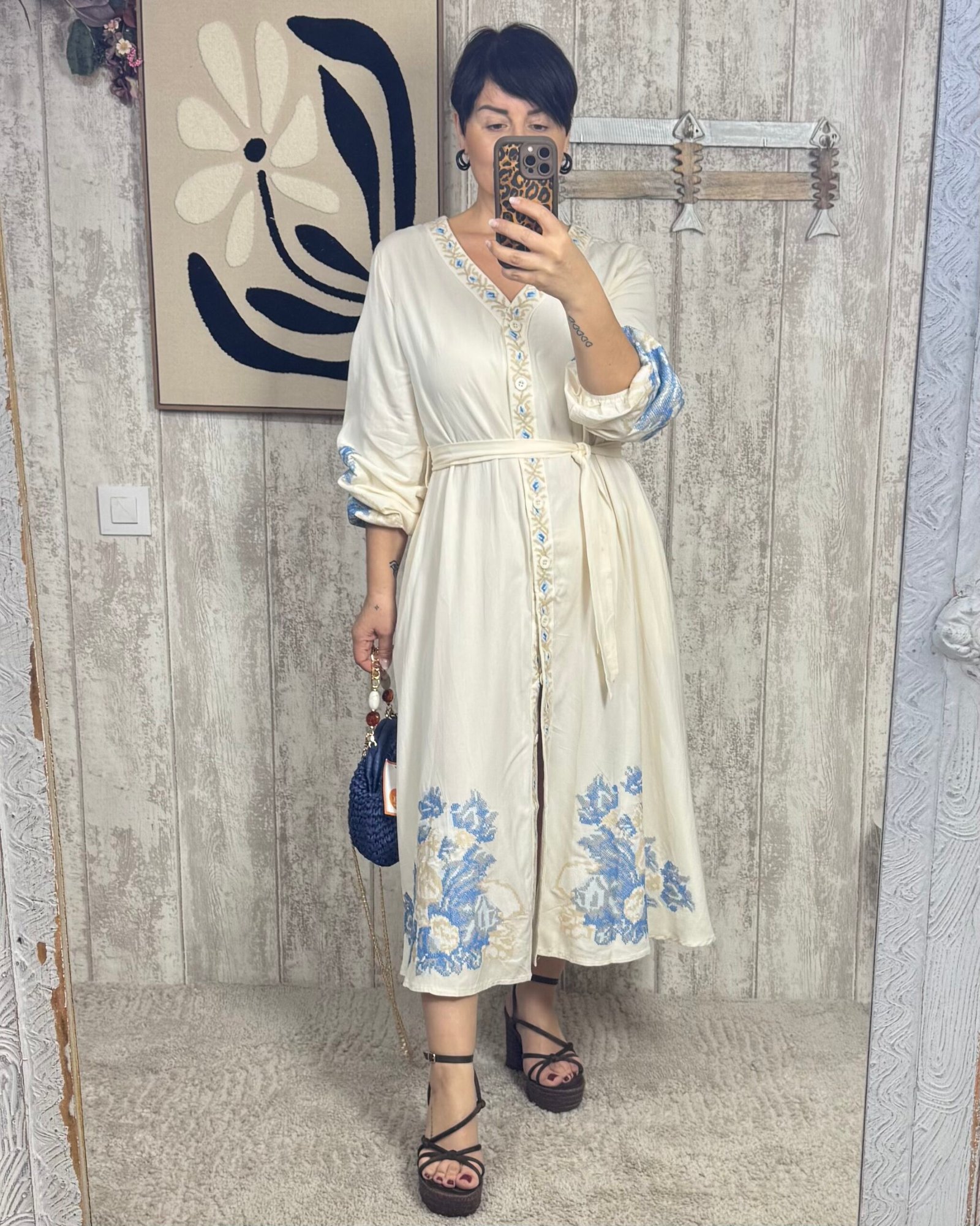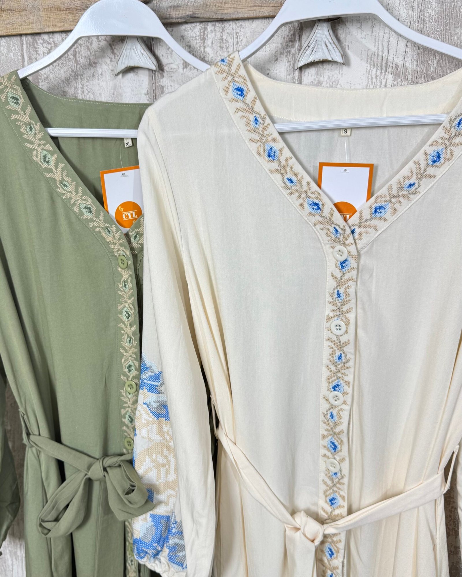 Vestido en corte midi, abotonado de arriba a abajo. Con bordados en punto de cruz, una maravilla!