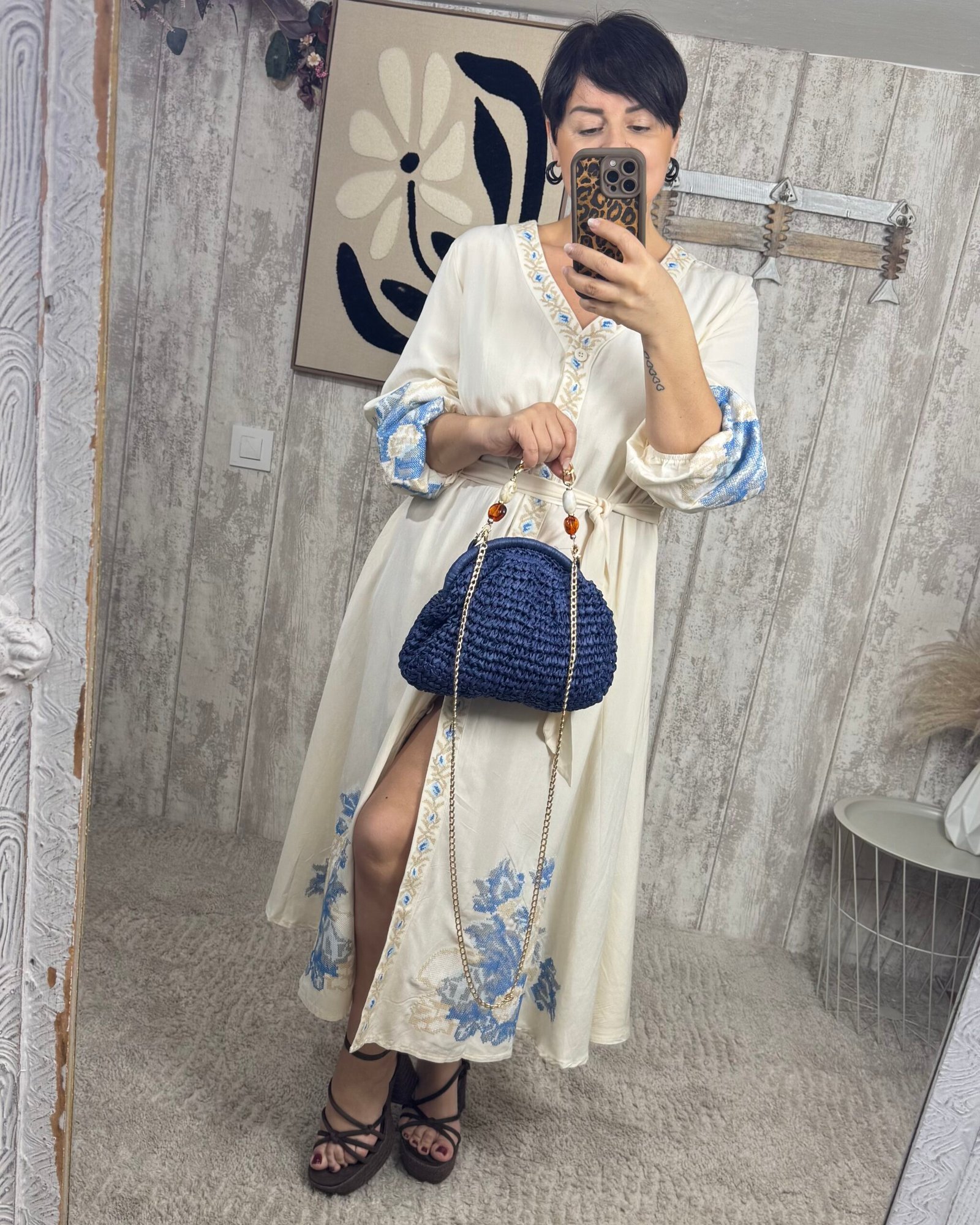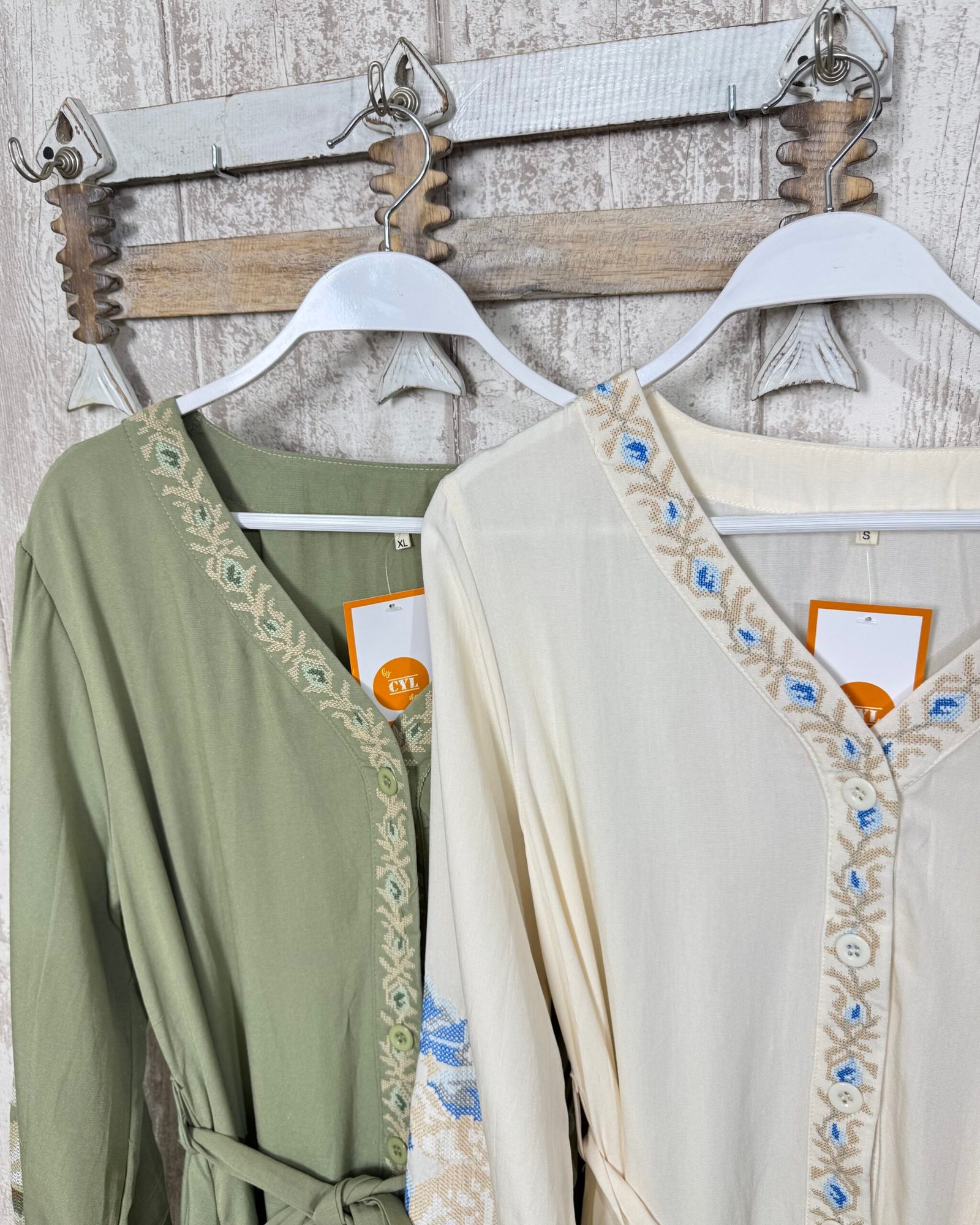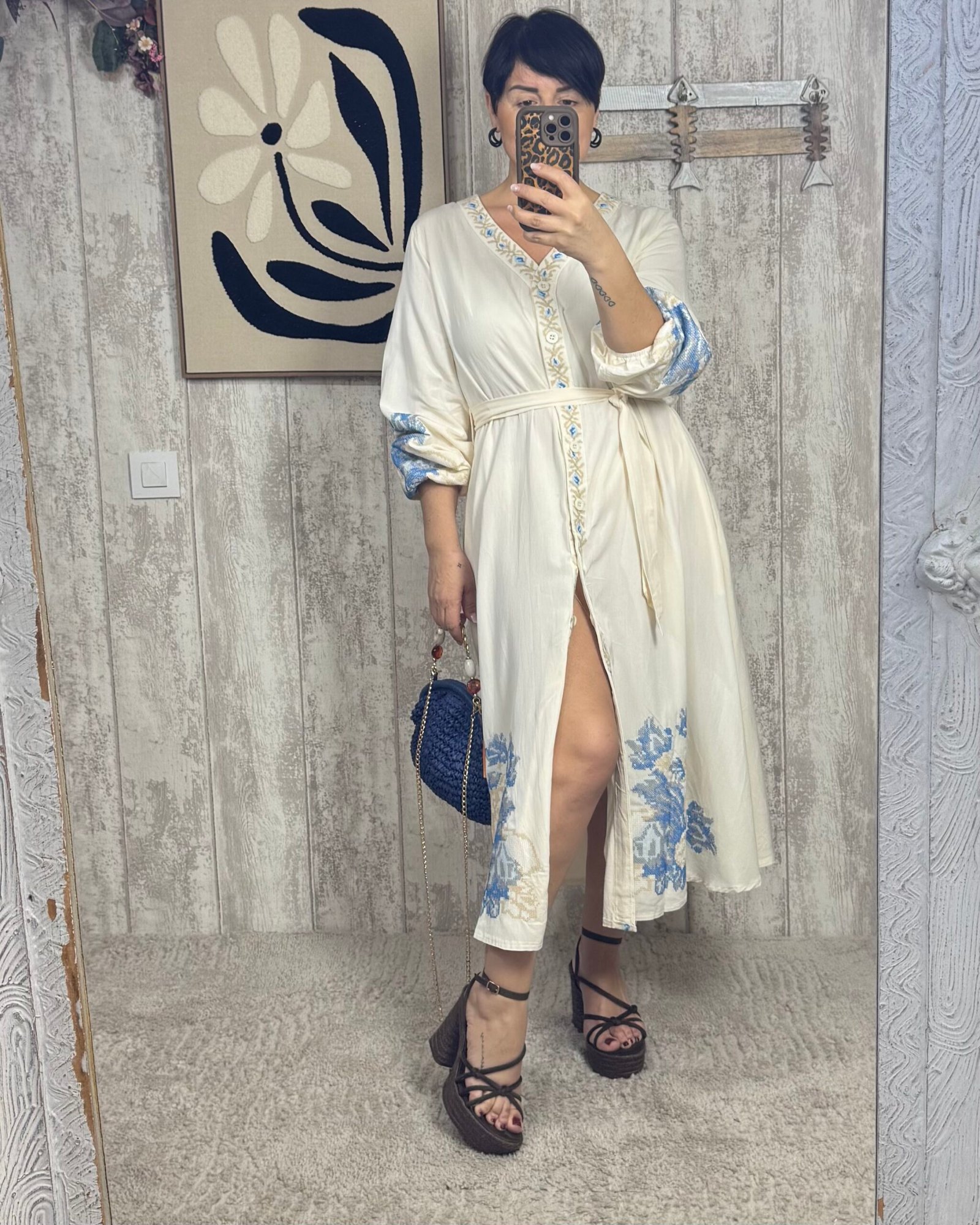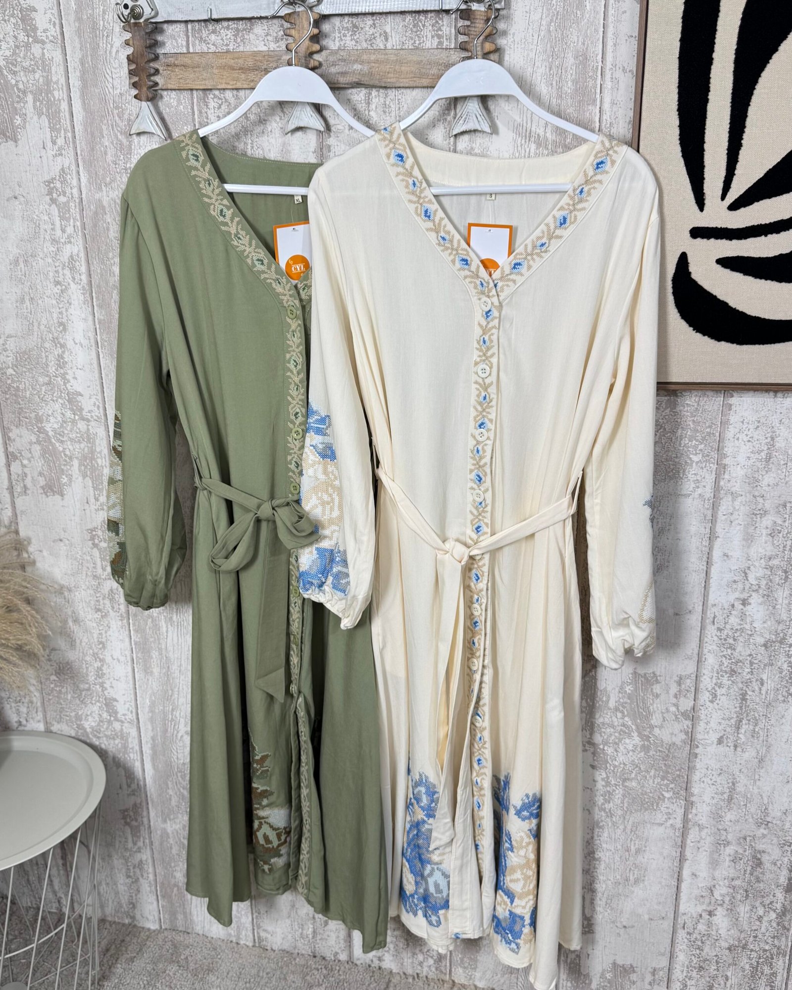 Vestido en corte midi, abotonado de arriba a abajo. Con bordados en punto de cruz, una maravilla!